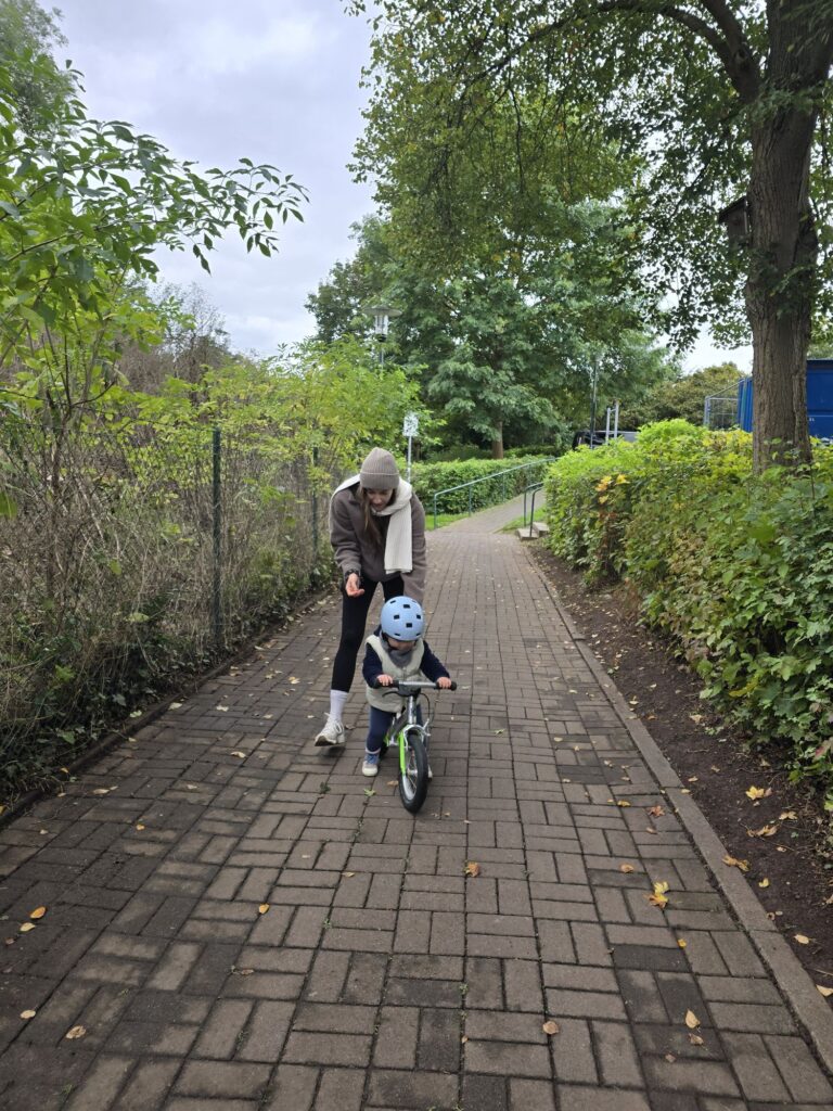 Nach dem Schläfchen gab es erstmal was zu futtern. Dann sind Mama und Papa mit Mika zum Sportplatz gegangen. Mika ist gefahren – mit seinem großen Laufrad. Das geht jetzt schon voll gut.