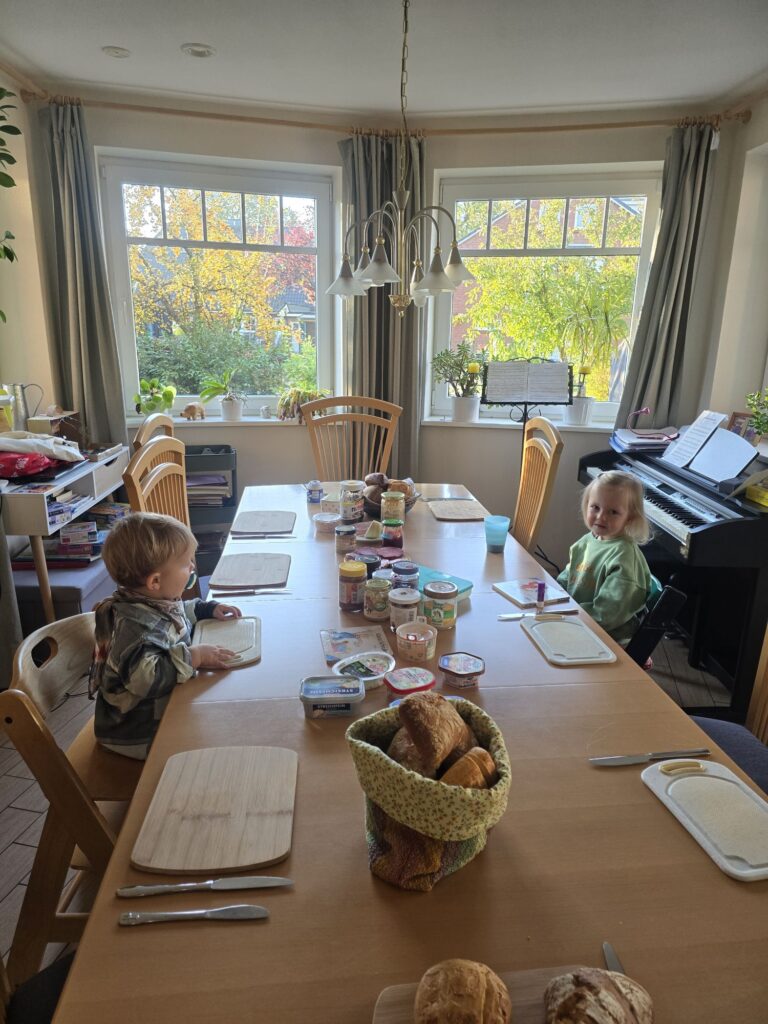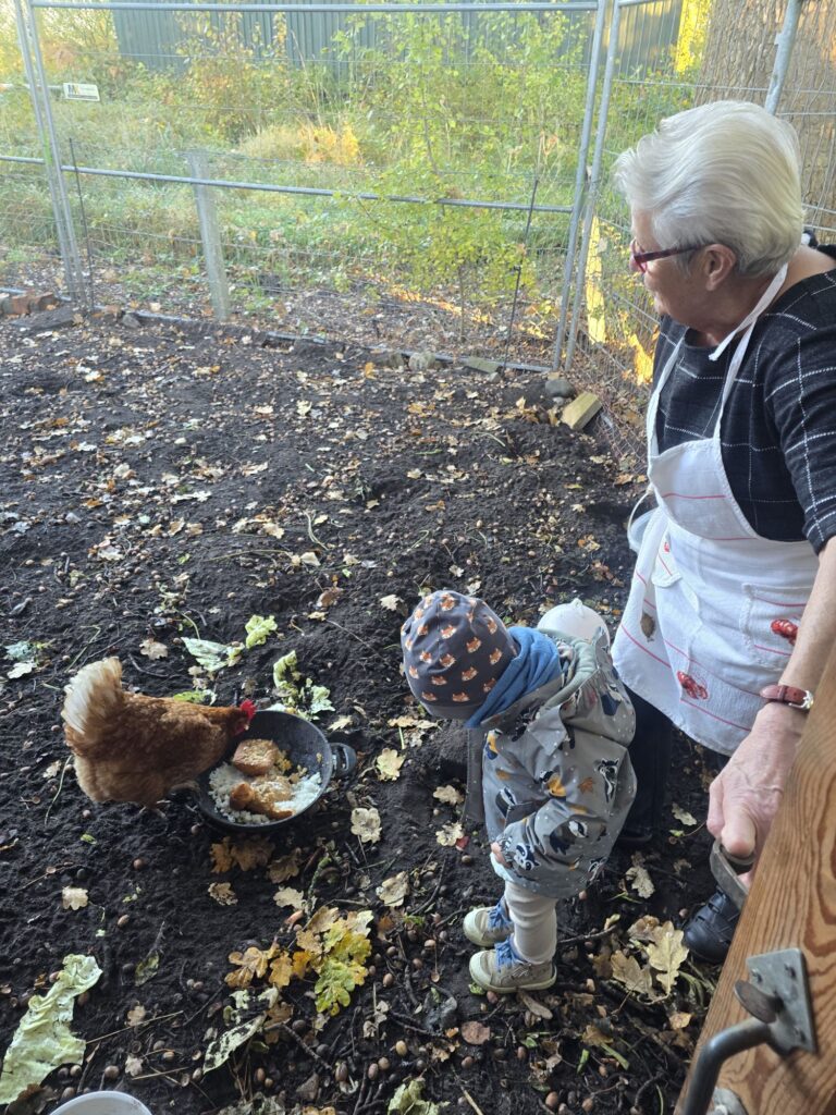 Heute früh gab es noch mal ein gemeinsames Frühstück, bevor es dann Richtung nach Hause ging. Davor aber natürlich noch ein bisschen spielen und mit Oma die Hühner füttern.