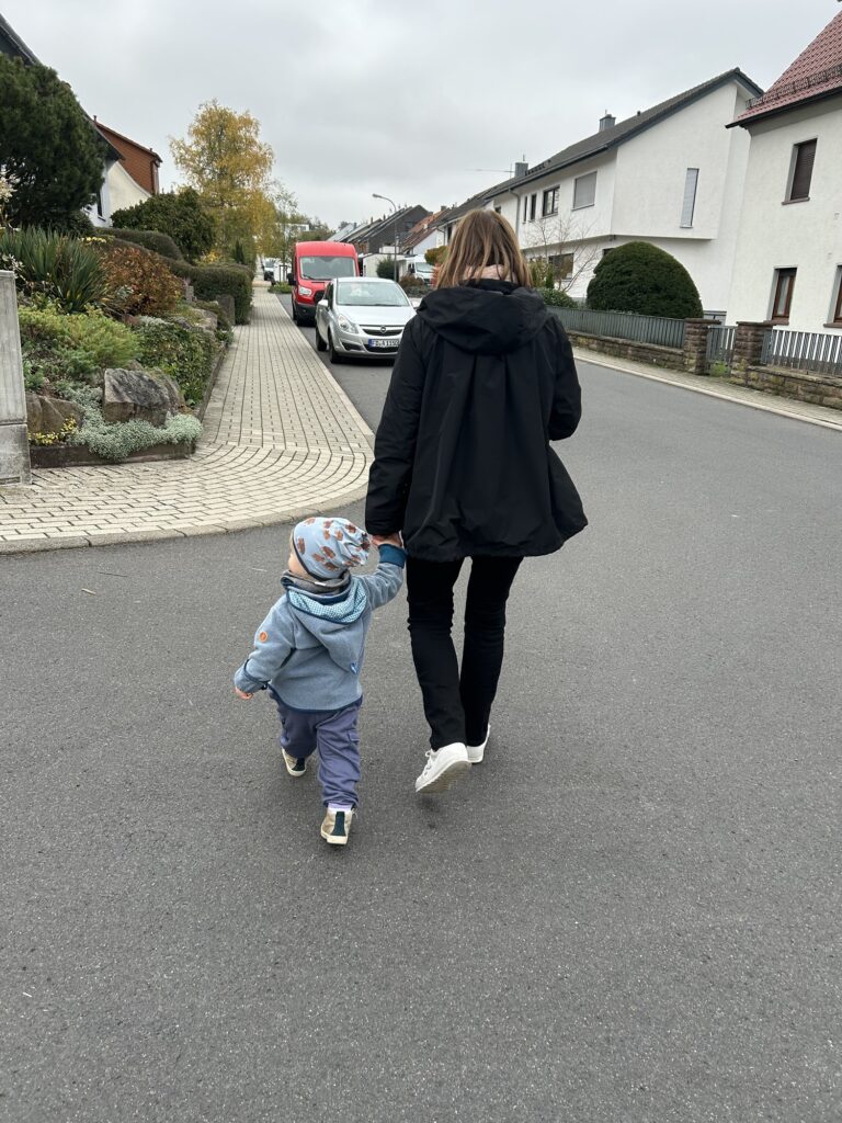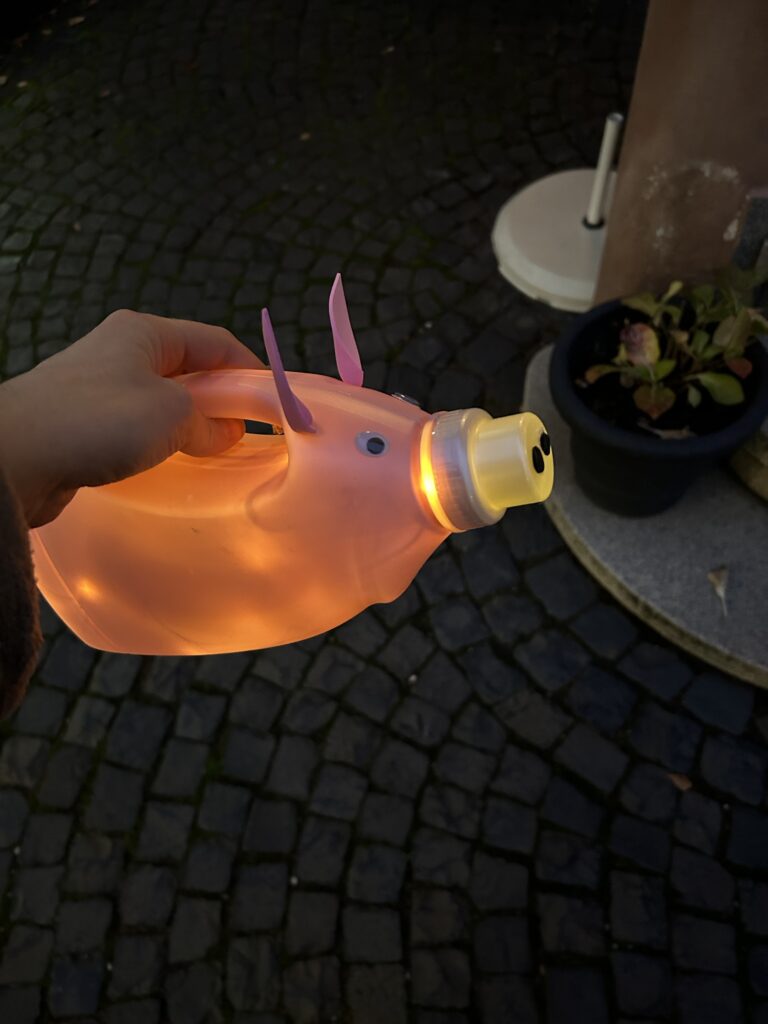 Nach dem Mittagsschlaf wurde dann gleich wieder losgespielt. Mama hat zum Rumleuchten für Mika eine kleine Schweinelaterne gebastelt, die sollte dann mit in die Stadt zum Kuchen essen. Nach dem Kuchen war Mika ganz aufgeregt und ist wie ein kleiner Flummi durch die Straßen bis zum Auto gehüpft.