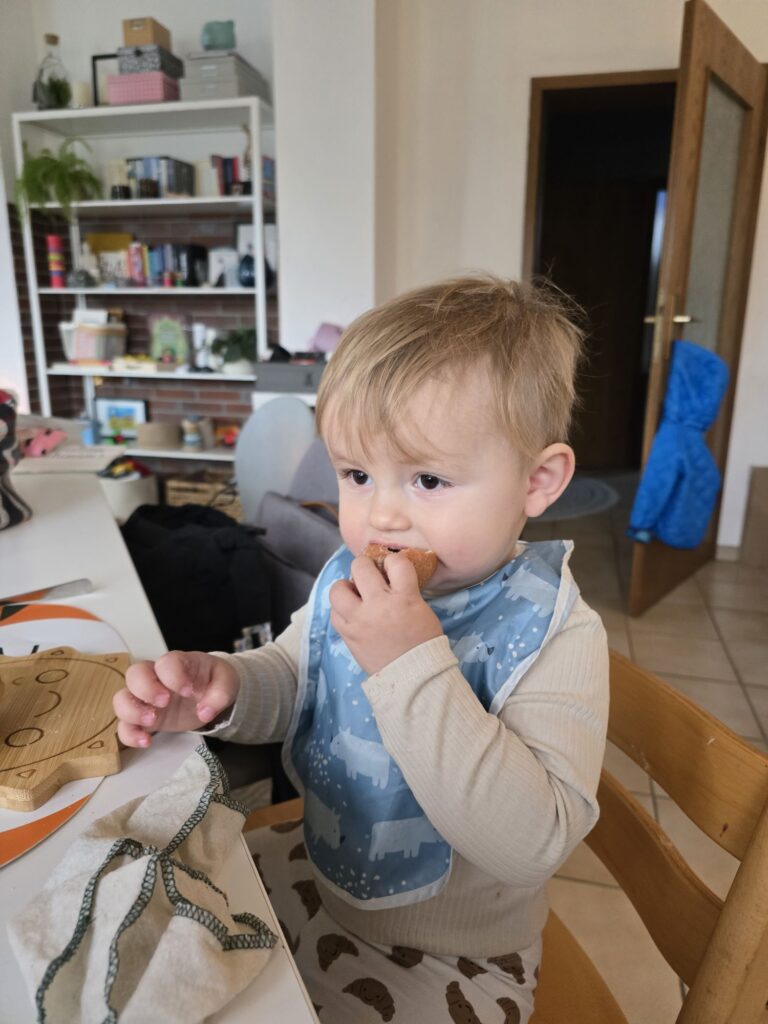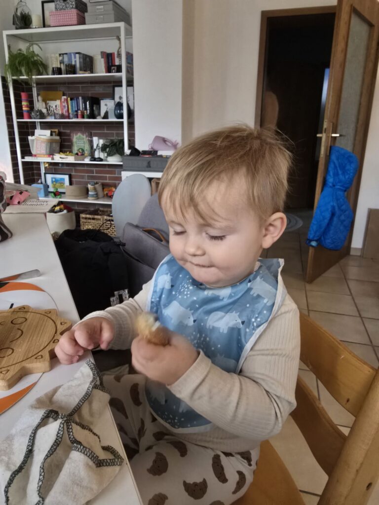 Um zehn waren Mama und Mika zum Pekip Revival Treffen verabredet. Vorher sind Mika und Papa noch zum Bäcker gefahren und Mika hat ein Quarkbällchen geschenkt bekommen. Kurz probieren durfte Mika am Auto. Den Rest hat er dann beim Frühstück gegessen. Es könnte ein neues Lieblingsessen sein.