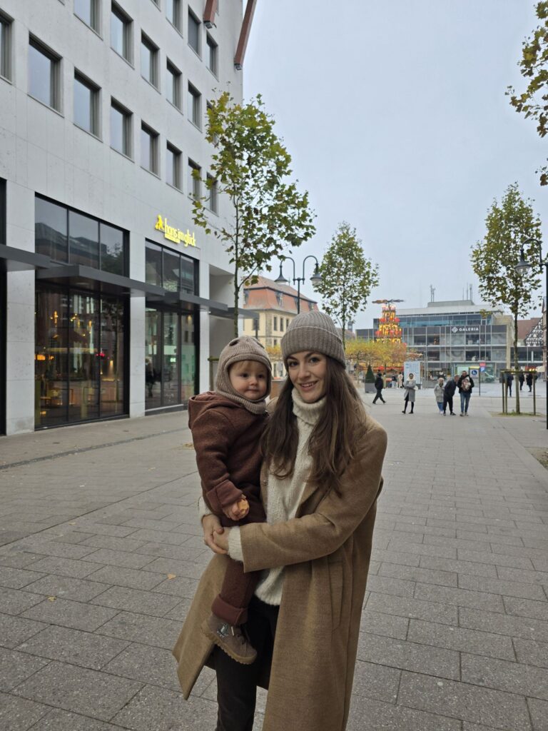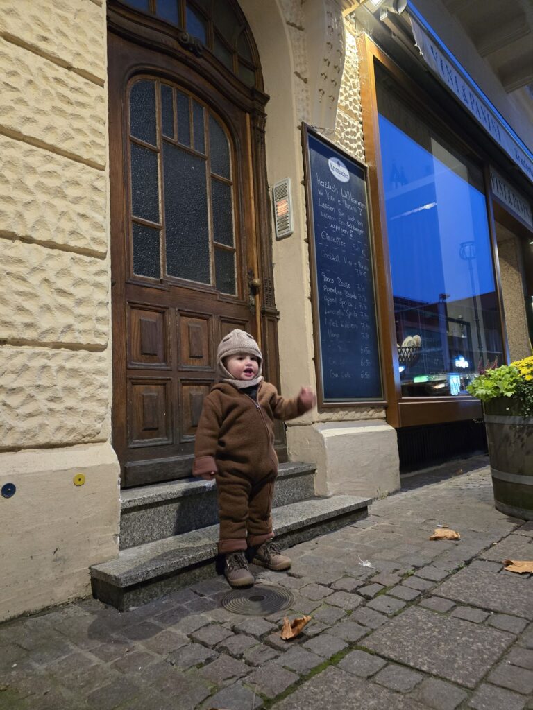 Danach gab es Mittagessen und anschließend sind Mama, Mika und Papa in die Stadt gefahren. Nach einem Spaziergang durch die Stadt gab es im Café Glück für jeden ein Stück Kuchen. Und für Mika heißen Milchschaum. Das war voll gut.