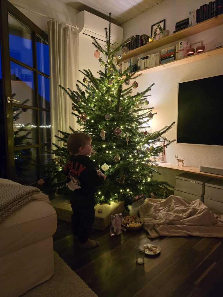 So richtig kann sich Mika Weihnachten noch nicht vorstellen, aber heute Abend haben wir den Weihnachtsmann knapp verpasst. Nach dem Umziehen war die Milch ausgetrunken, die Balkontür stand offen und von den Keksen waren nur noch ein paar da.