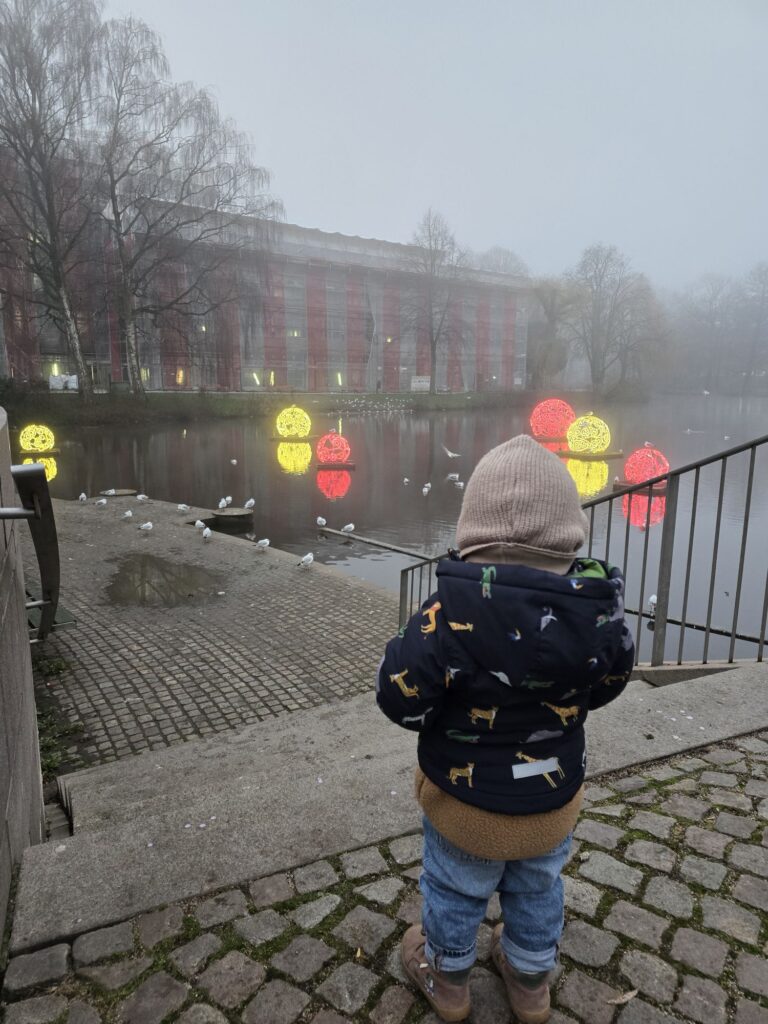 Oma hatte die schöne Idee am Nachmittag zusammen in den Tierpark zu gehen. Aber oh nein, der Tierpark hatte nur noch eine Stunde geöffnet und es war super neblig, so dass es sich nicht gelohnt hat noch reinzugehen. Deswegen war ein Spaziergang durch die Stadt angesagt. Mika war ganz fasziniert von den Möwen auf dem Wasser.