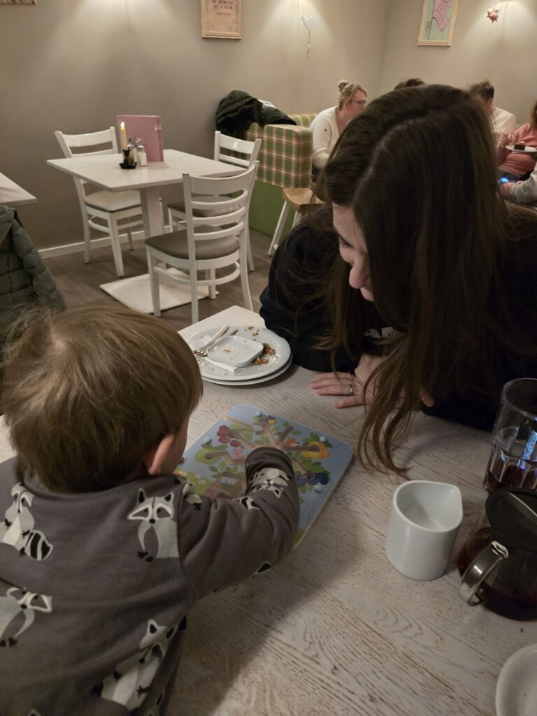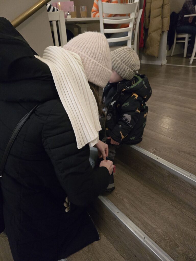 Am Nachmittag ist Mama zum Kleidertausch in die Stadt gefahren. Papa und Mika sind mit dem Kinderwagen später los und haben Mama abgeholt, um zusammen noch ins Café zu gehen. Mika hat alle Spielsachen des Cafés durchgespielt und mit großem Genuss seinen Kuchen gegessen. Beim Anziehen hat Mama Mika erst einmal Entenfüße angezogen, hihi. Das musste auf der Treppe gleich richtig gemacht werden.