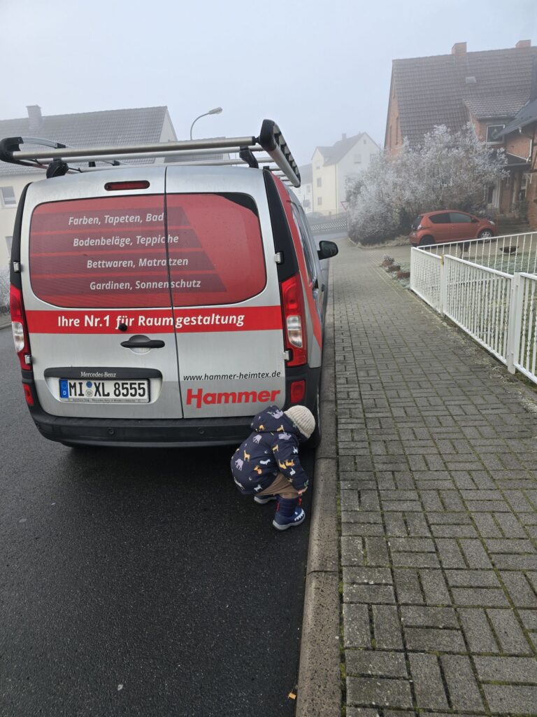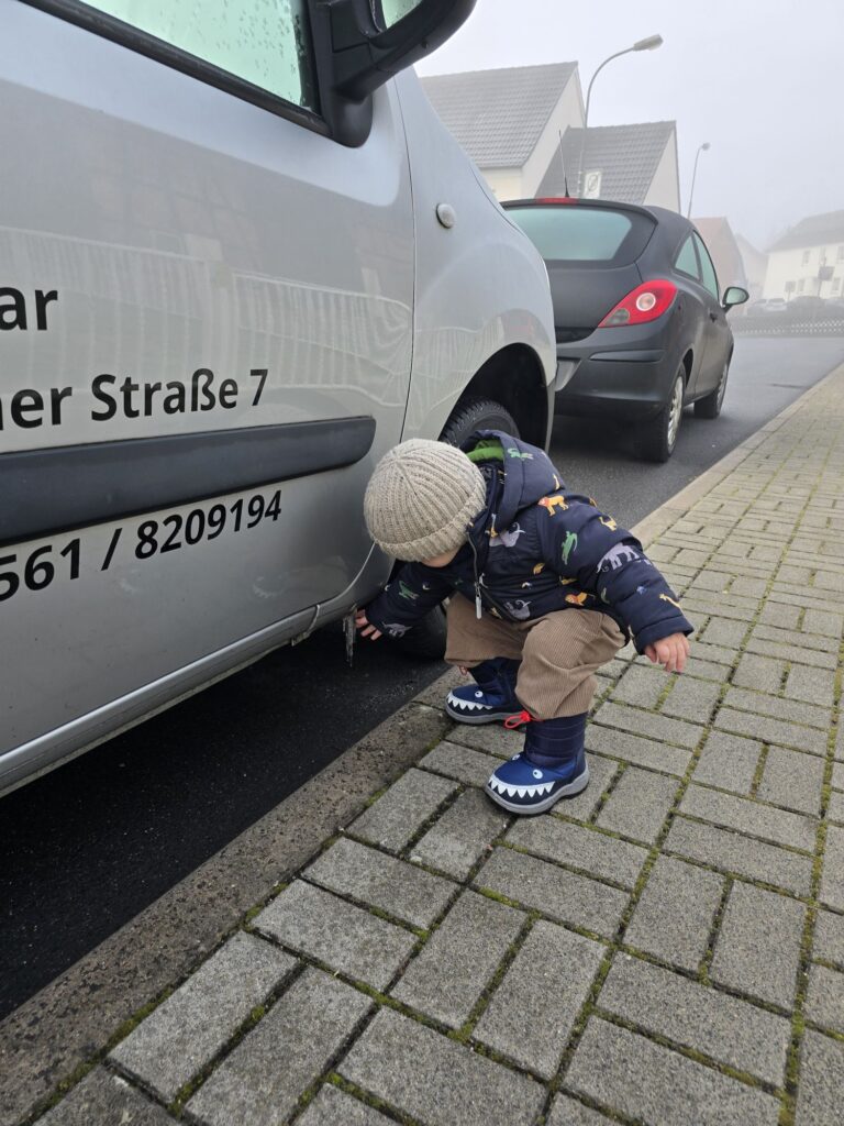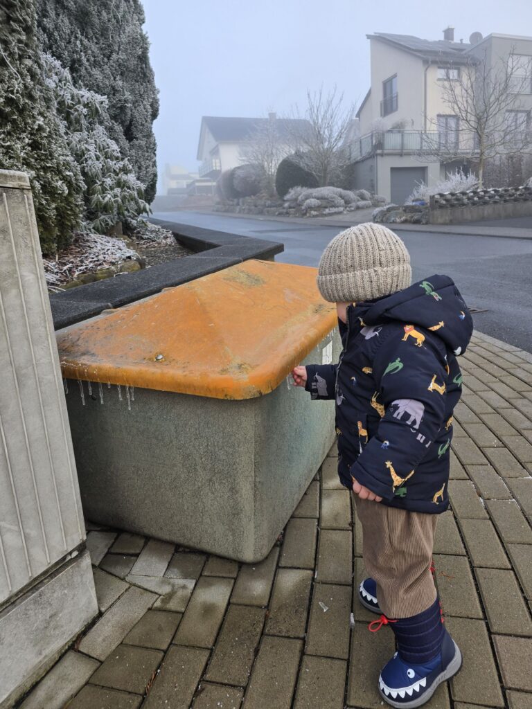 Papa und Mika sind morgens bei dollem Nebel und ganz kalten Temperaturen unter null zu Fuß zum Bäcker gegangen. Dabei hat Mika Eiszapfen kennengelernt und war ganz fasziniert. Überall hat er die abgemacht oder weggetreten 😅.