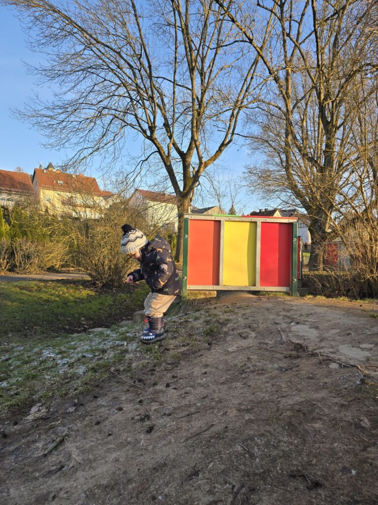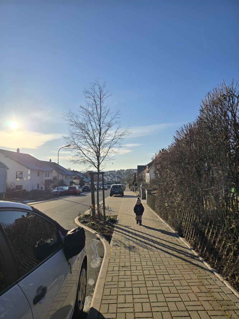 Heute war die Nacht wieder um 6.00 Uhr zu Ende. Mama, Mika und Papa sind morgens zusammen durch die kalte Luft zum Bäcker gegangen.