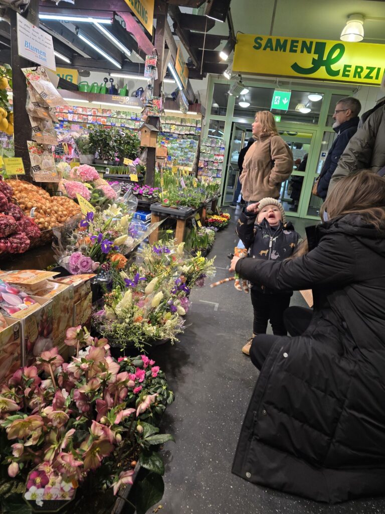Nach einem Schnuppergang durch die Kleine Markthalle ist die Reisegruppe noch in der Neuen Altstadt, am Main, in Sachsenhausen und auf der Zeil gewesen. Es war überall ganz schön voll in der Stadt. Und durch die Demo gegen Rechts war der Römer und die Umgebung total verstopft. Nachmittags ging es aber auch dort.