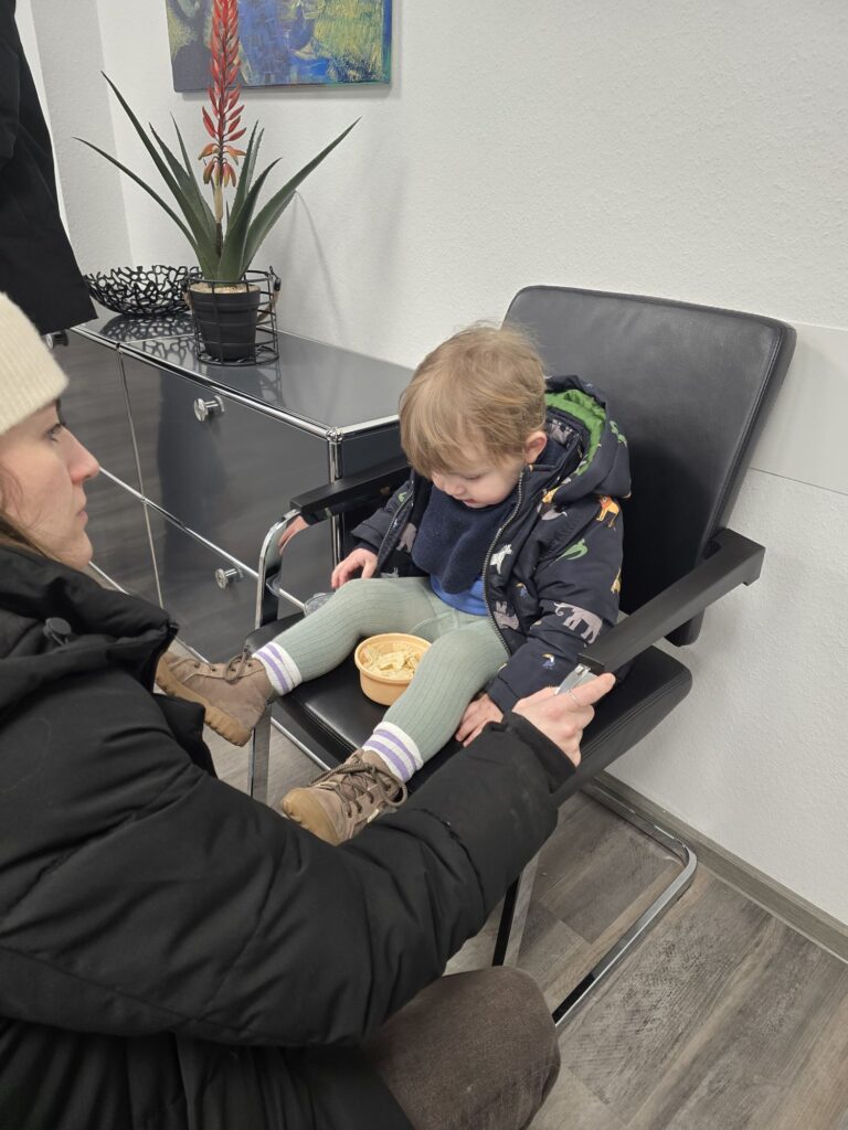 Papa hat Mika dann vom Kindergarten abgeholt und zusammen ging es mit Mama zum Hautarzt. Die Ärztin hat bei Papa Fäden gezogen und Mikas Muttermal am Fuß angeguckt und fotografiert. Die Zeit im Warte- und auch im Behandlungszimmer waren voll einfach und schön mit Mika.