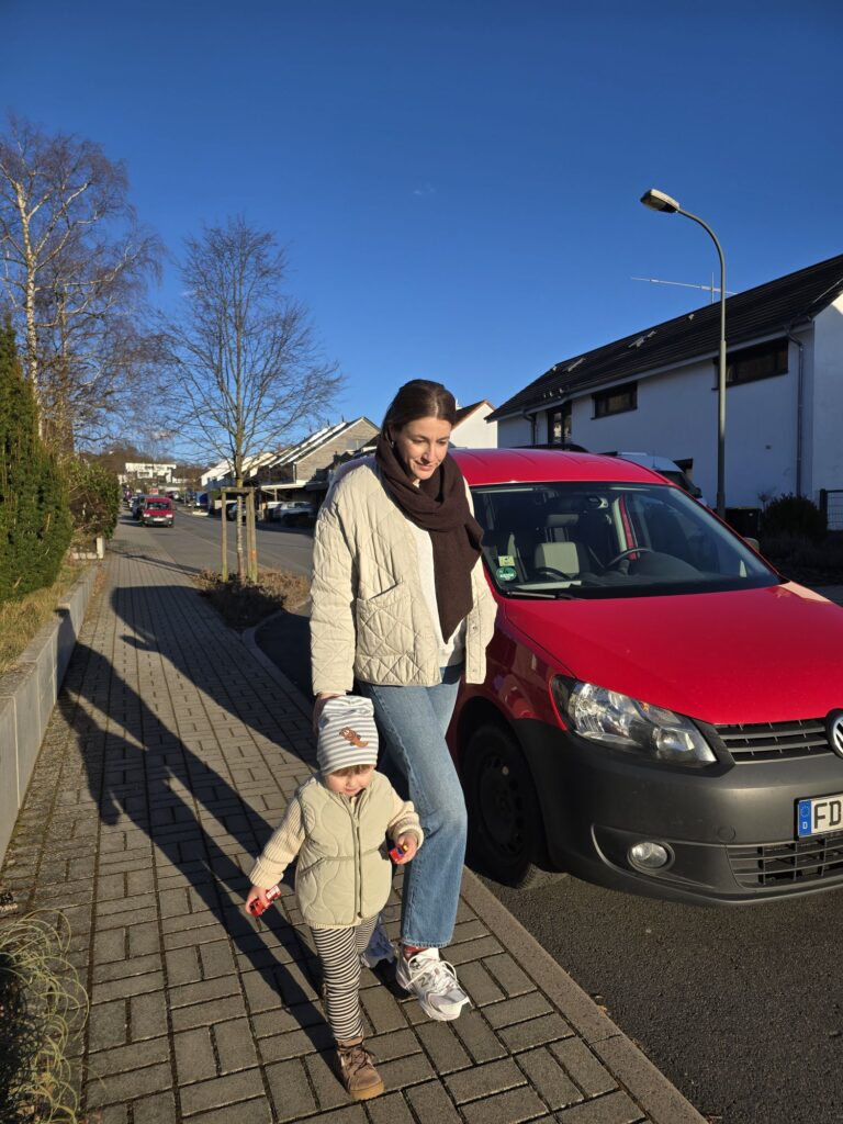 Mika hat mit Mama und Papa im großen Bett der airbnb Wohnung geschlafen. Um 5.30 Uhr war die Nacht dann aber für Mika zu Ende. Für Mama und Papa, die um halb zwei ins Bett gegangen sind… 🥱🥱🥱… war das ganz schön früh. Also alle leise anziehen und raus zu Iddzi, um erst mal einen dicken Stromhalm zu suchen, damit die Rückfahrt ohne Ladestopp klappt. Danach sind die drei ein bisschen durch Essen spaziert, haben den Häschen und Eichhörnchen im Hasenpark hallo gesagt, dann noch Brötchen geholt und danach mit Tjark und Sack und Pack losgefahren. Bei Oma gab es nämlich um 10.00 Uhr Frühstück.