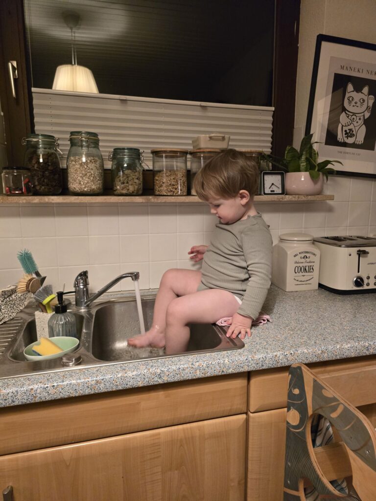 Mama hat mit Mika noch Sport gemacht und dann ging es ins Bett. Vorher mussten aber die Füße noch gewaschen werden.