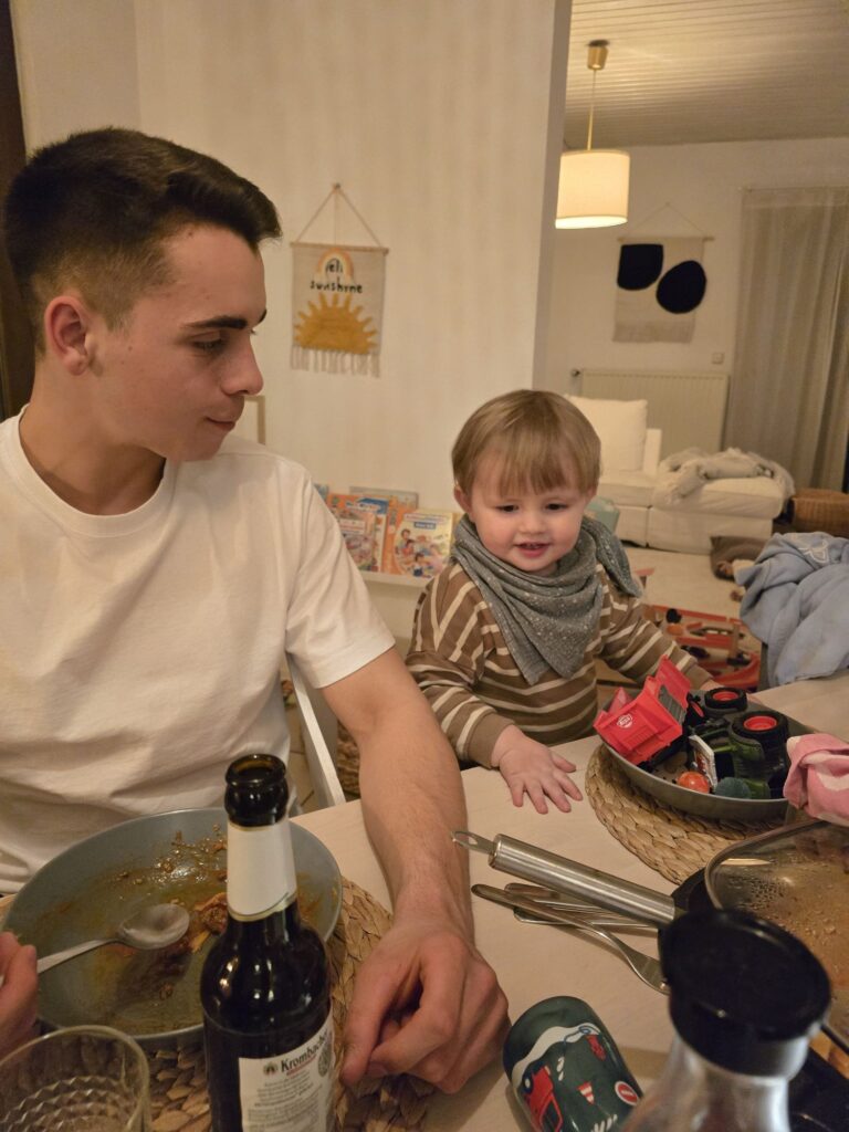 Aber auch am Nachmittag war Mika dann ganz kuschelbedürftig. So haben Papa und Mika zusammen gekocht und dabei immer wieder gekuschelt.