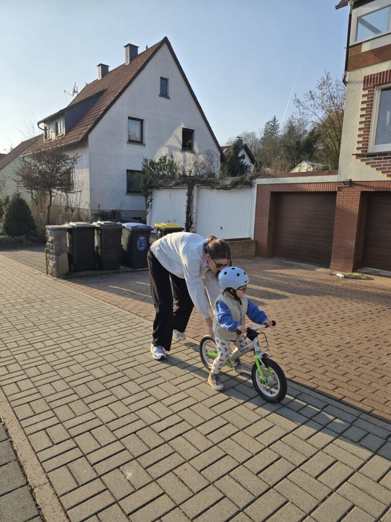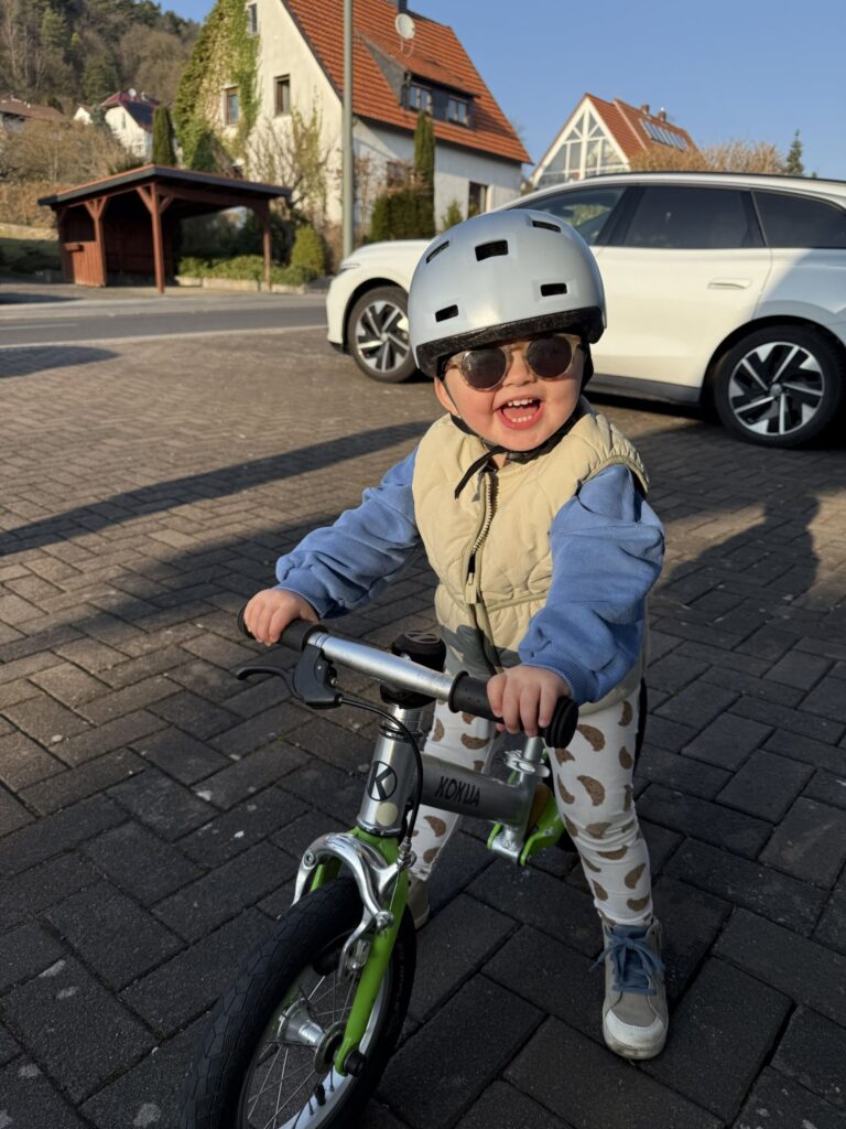 Nach schöner Zeit bei Oma sind Mika und Mama dann um eins nach Hause gefahren. Mika wollte dann gleich mit seinem Laufrad fahren. Das ging schon voll gut. Mika hat den Dreh jetzt raus. Mama war voll die gute Fahrlehrerin. Weil Papa heute zum Milseburgtunnel und wieder zurück gegangen ist, konnte er nur langsam mitgehen.