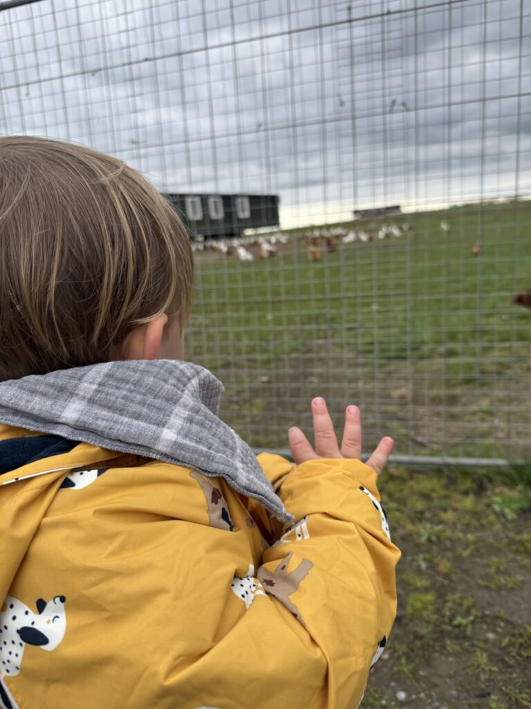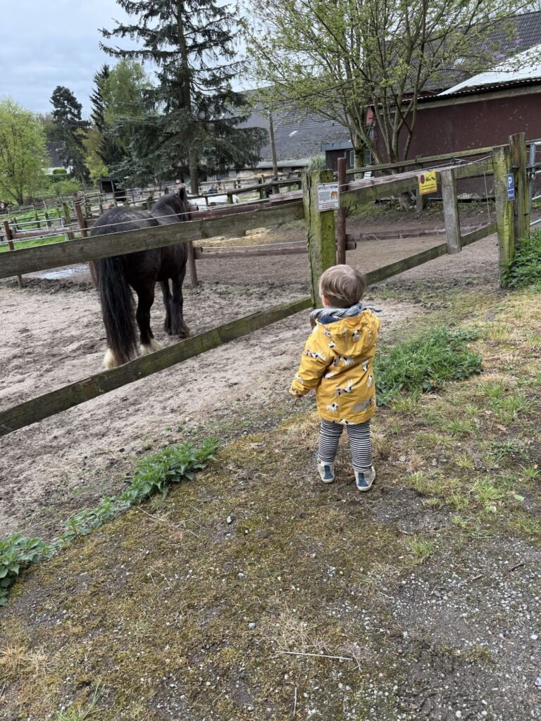 Dann ging die Fahrt los. Mika ist gleich eingeschlafen aber schon nach der Hälfte wieder aufgewacht. Die blöde Umleitung hat die Geräuschkulisse verändert. Nach einer ziemlich langen Fahrt war es dann soweit und der Hof war in Sichtweite. Kaum stand das Auto, hat Mika gesagt „ich will kringeln“.