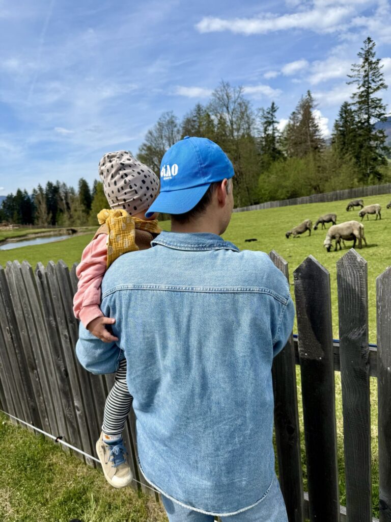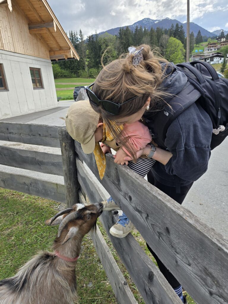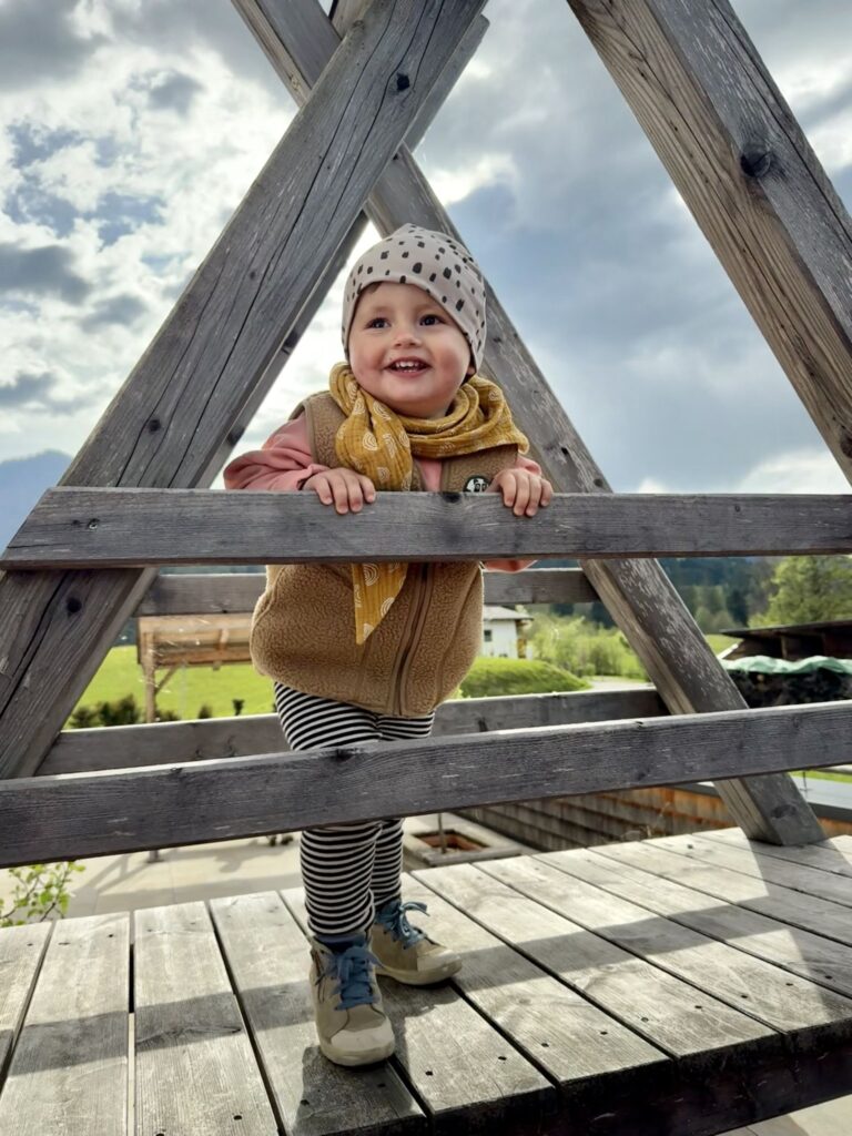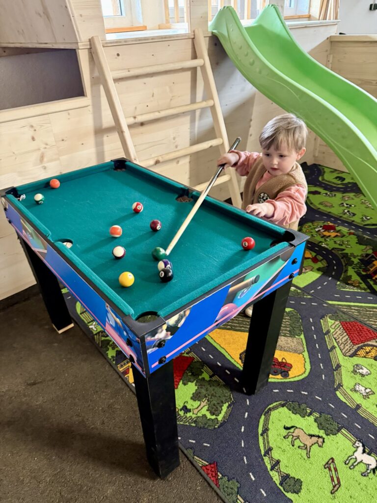 Vor dem Mittagsschlaf sind Mama, Mika und Papa noch raus und haben den Tieren hallo gesagt und Ball gespielt. Vorher hatten Mika und Papa sich die Zeit in der Spielscheune vertrieben. Mika ist von dem Kinder-Billard ganz verzückt.