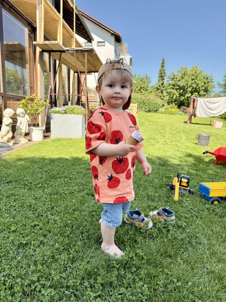Ab in den Kindergarten ging es also mit Mama. Ganz fröhlich und so stolz auf sein neues T-Shirt (mit den Tomaten „Ketchup soon).