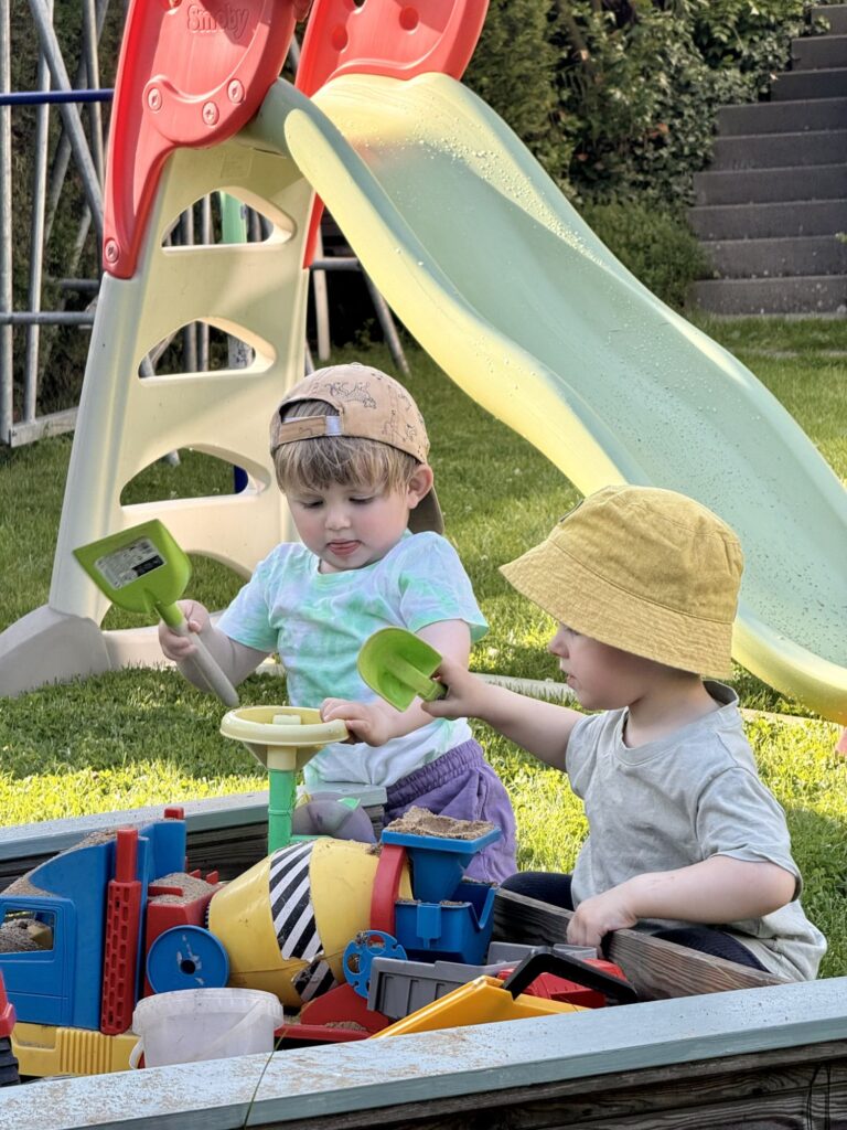 Nachmittags hat Mama Mika mit dem Fahrrad abgeholt. Nachmittags kamen Caro und Vinnie zu Besuch. Es war ein toller Sommertag im Garten. Mika und Vinnie haben die Wasserspritzkanonen ausprobiert.