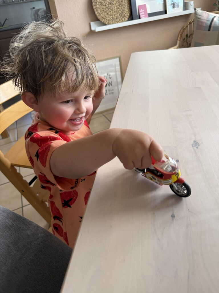 Von Waltraud und Peter hat Mika sich ein Fahrzeug aus der Fahrzeugekiste aussuchen dürfen. Mika freut sich ganz doll über das Motorrad.