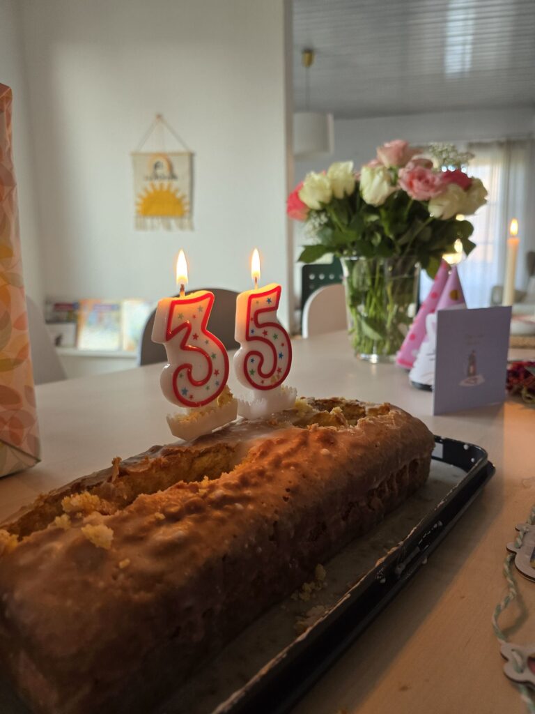 Der Morgen ging gleich aufregend los. Es war Mamas Geburtstag. Der Tisch war schön geschmückt und es gab einen Kuchen. Mika war ungewollt ein kleiner Teufel und hat den Zitronenkuchen aus der Backform mit den GeburtstagsZlzahlen gemeuchelt, während Mama und Papa im Badezimmer waren. Eigentlich wollte er damit wohl nur spielen.