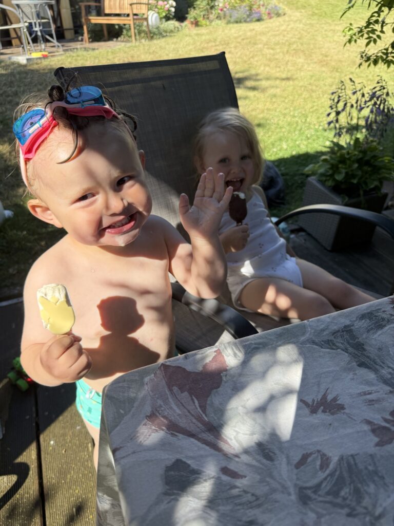 Am Nachmittag kamen Vera und Flora zu Besuch. Darüber hat sich Mika, und Mama auch, sehr gefreut. Die beiden sind nackt im Garten rumgelaufen und Mika hat unendlich im Planschbecken gespielt.