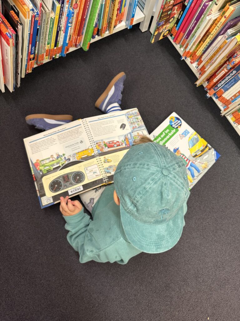 Am Nachmittag ging es dann gleich in die Bücherei. Mika hat sich ganz viele neue Bücher ausgesucht. Das Highlight ist ein Buch über Rennfahrzeuge.
