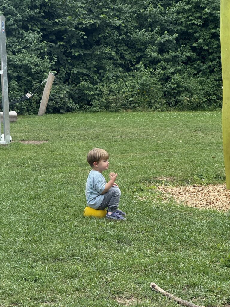 Nachmittags ging es dann mit Vinnie und Caro auf einen neuen Soielplatz. Hier gab es herrlich viel Platz zum Rennen und Fußballspielen, außerdem eine coole Tellerbahn auf der Mama und Mika ein paar Mal gefahren sind. zum Schluss hat Mika im Sand noch einen kleinen Schatz gefunden – eine kleine Eulenfigur!