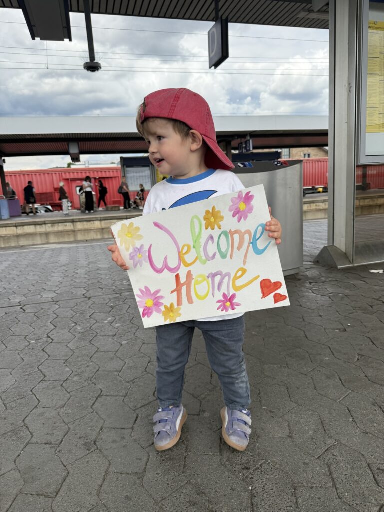 Posted on 24.07.202527.07.2025 Morgens war noch Kindergarten und Mama hat Mika noch bequem abholen können. Der Zug vom Flughafen hatte nämlich Verspätung. Mit dem schönen Schild „welcome home“ hat Mika dann schon am Bahnsteig gewartet, als die Urlauber endlich ankamen. By Mama Alltag