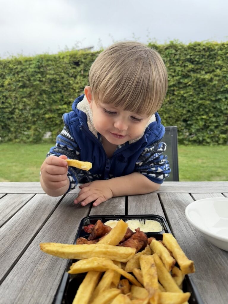 Auf den Rückweg hat Oma Pommes und Fisch geholt, da hat Mika voll reingehauen.