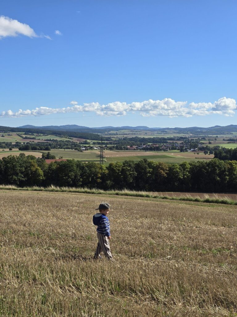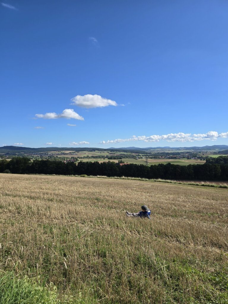 Mama ist früh losgefahren, um Mikas neuen, alten Schreibtisch abzuholen. Mika und Papa haben sich Picknick gemacht und sind mit dem Fahrrad erst zum Bäcker und dann mit Quarkbällchen und Schokobrötchen um den Rauschenberg zur schönsten Bank. Es war ein schönes Frühstückspicknick mit Marmeladenbrot, Ei, Tomaten, sauren Schlangen und eben Quarkbällchen und Schokobrötchen. Nach dem Picknick war noch ganz viel Zeit, um im Gras zu spielen und die abgeerntete Koppel zu untersuchen.
