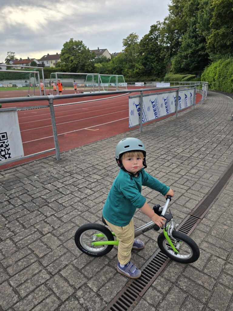 Am Nachmittag hat Papa Mika mit dem Fahrrad abgeholt. Nach einer Stunde Arbeit, die für Mika bedeutete, dass er alleine spielen musste, sind die beiden dann mit dem Laufrad zum Sportplatz gefahren. Da war ganz viel Fußballtraining der Kleinen. Dasfand Mika immer mal ganz schön interessant.