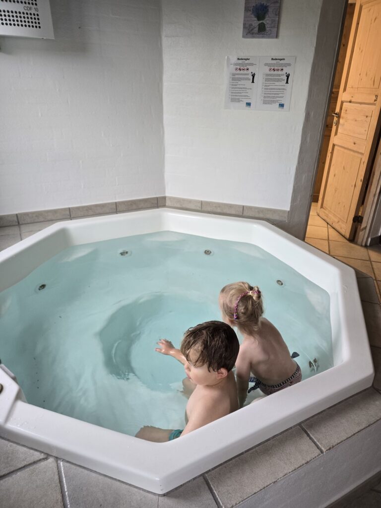 Wieder im Ferienhaus sind Mika und Thilda in den Whirlpool gegangen. Der war ganz warm und ganz blubberig. Das war so schön und so warm.