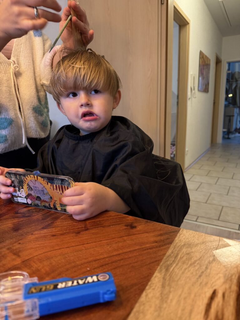 Am Nachmittag war es dann soweit. Mama ist mit Mika das erste Mal zum Frisör gegangen. Zu Henrys Mama. Henrys Mama hat die Haare geschnitten und Henry und Mika haben danach noch schön spielen können. Der erste richtige Haarschnitt, denn bisher hat Mama die Haare immer ein bisschen kürzer geschnitten. Mika war ganz geduldig und hat die 20min ganz still ausgehalten. Von den abgeschnittenen Haaren hätte man sicher ein kleines Kissen füllen können.