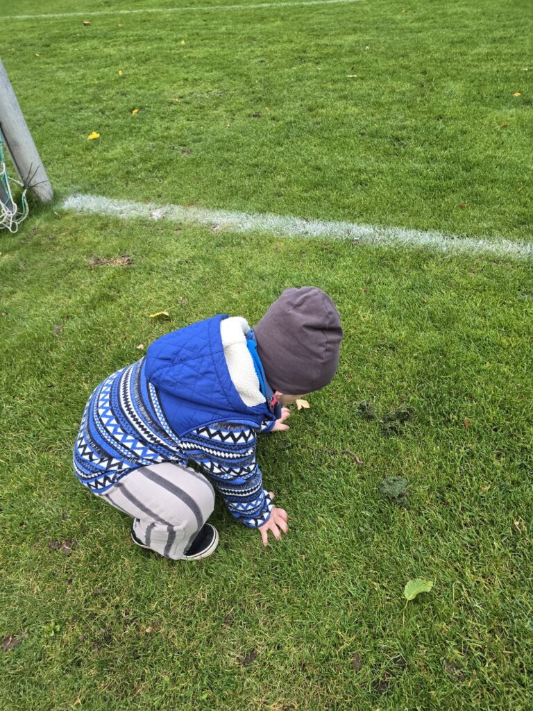Das Wetter war ziemlich herbstlich. Der Fußball hatte durch den starken Wind fast ein Eigenleben. Gerettet hat Mika einen großen Regenwurm. Der hatte sich auf der Tartanbahn verlaufen. Mika hat ihn so ins Herz geschlossen, dass er ihm zum Abschied noch einen Kuss geben wollte, bevor er auf dem Rasen in der Erde verschwunden war. Aber nein, Regenwürmer küssen wir nicht, hat Papa gesagt.