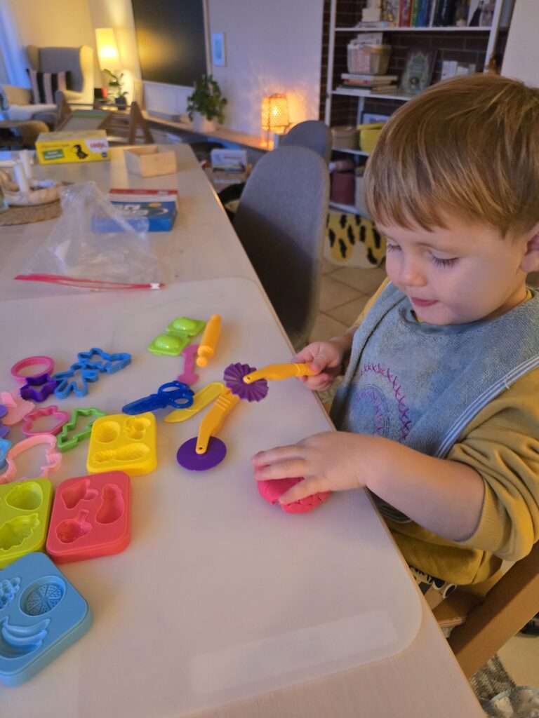 Später sind Mika und Papa noch mit dem Fahrrad um und über den Rauschenberg gefahren. Es war richtiges, kaltes, nasses Herbstwetter. Aber Mika wollte lieber eine Fahrradtour machen als auf den Fußballplatz zu gehen. Danach war noch eine große Knet-Session angesagt.