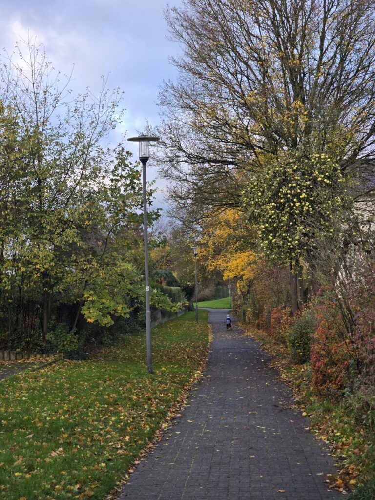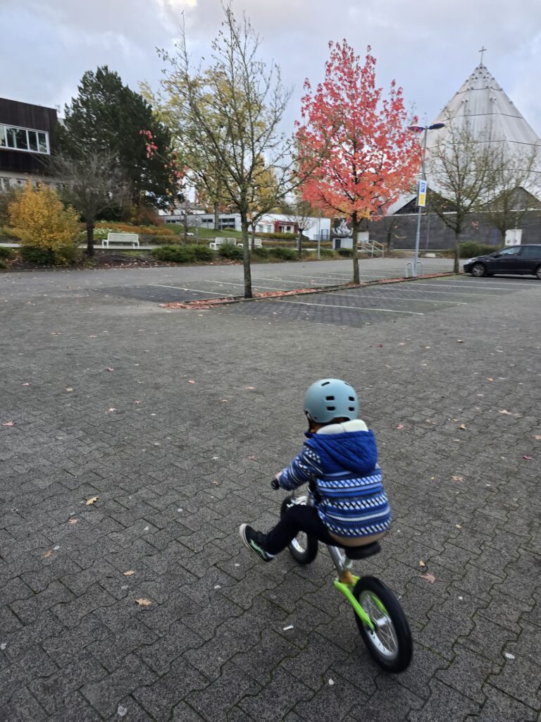 Mika und Papa sind heute früh nach dem Anziehen und zwei Toast mit Honig und Marmelade aufgebrochen in den noch fast dunklen Herbstmorgen. Mit dem Laufrad ab zum Bäcker. Es war ziemlich kalt. Mikas Pfoten waren erst kalt beim Fahren, aber dann ging es.