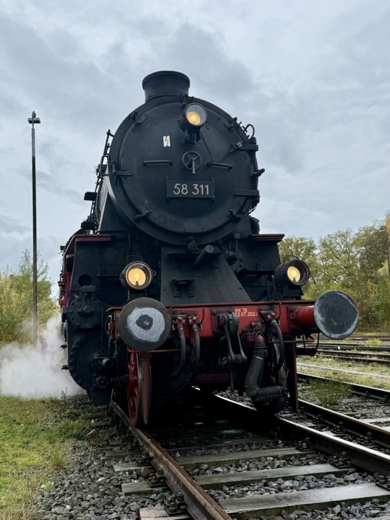 Und dann ging es direkt los zum Bahnhof. Das Wetter war ganz herbstlich mit leichtem Regen. Das hat aber gar nichts gemacht. Es war noch genug Zeit, um sich das stolze Dampfross noch in Ruhe anzuschauen. Und dann ging die Fahrt los. Im Wagen Nr. 3 auf den reservierten Plätzen. Bis nach Alsfeld hat es ca. 1 Stunde gedauert. Dort war dann auch eine Stunde Aufenthalt und Mika konnte zugucken, wie die Feuerwehr die Dampflok mit Wasser betankt hat. Das kam von einem Hydranten und wurde vom Feuerwehrfahrzeug zur Dampflok gepumpt. Mika hat sich alles genau angeguckt.