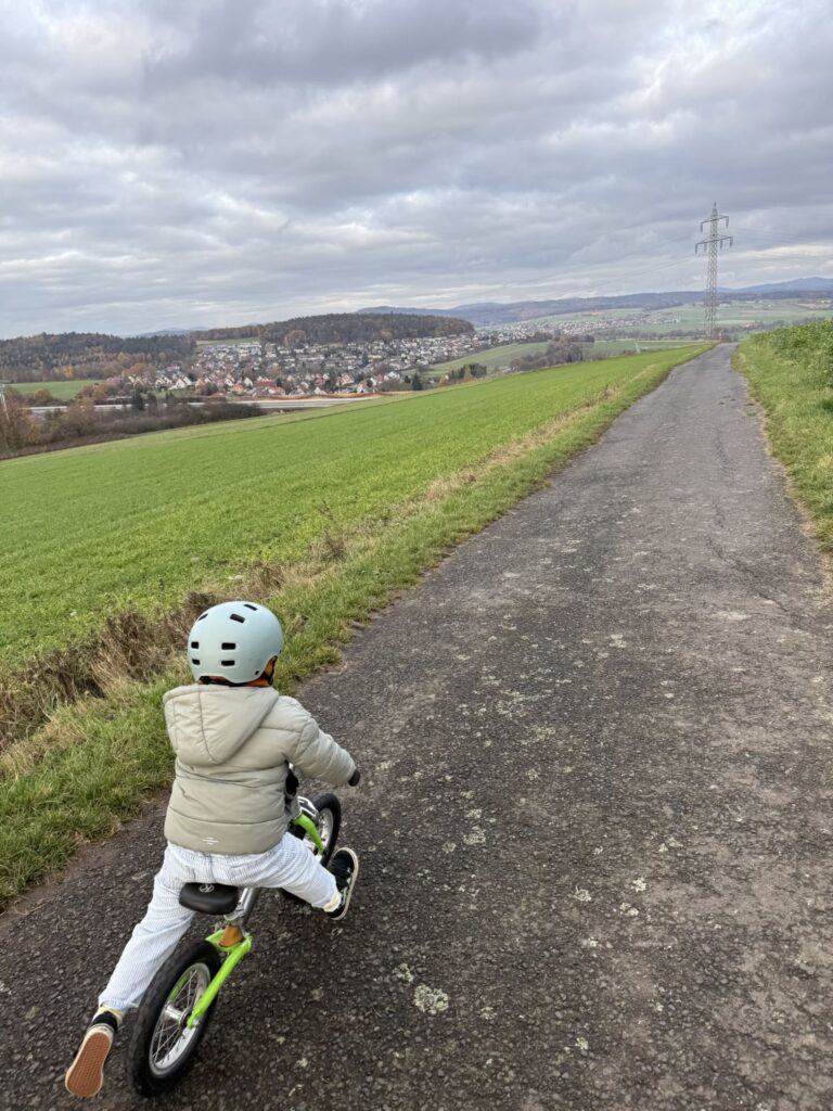 Nachmittags hat Mama Mika abgeholt und das Laufrad mitgebracht. Die beiden haben eine große Runde zurück um den Berg und noch durch die Grüne Lunge gedreht.