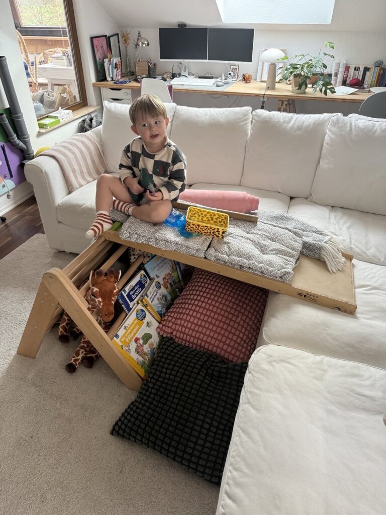 Papa und Mika sind heute früh zusammen aufgestanden. Nach kurzer Sortierung und Anziehung haben die beiden die Küche aufgeräumt. Mika auf dem Boden und Papa in den Schubladen.