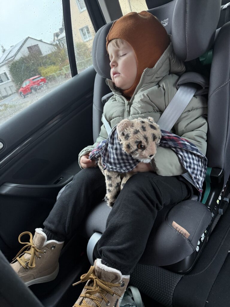 Im Kindergarten war Mika nur den Vormittag. Er wollte gerne gehen, aber Mama wollte, dass er den Mittagsschlaf zu Hause macht. Falls es wieder so weh tut. Also war der Kompromiss, dass Mama schon nach dem Mittagessen kommt und Mika abholt. Auf dem Weg nach Hause ist Mika auch prompt im Auto eingeschlafen.
