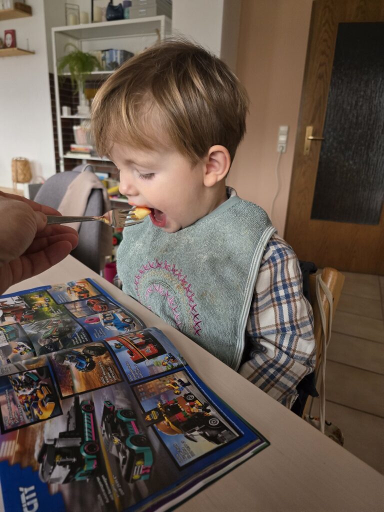 Papa hat zum Abendessen dann Senfeier gemacht. Mika hat aber nur das Ei und ein paar Bisse Kartoffeln gegessen. Und einen Kinderjoghurt.