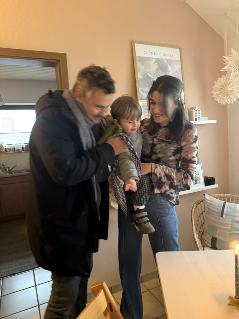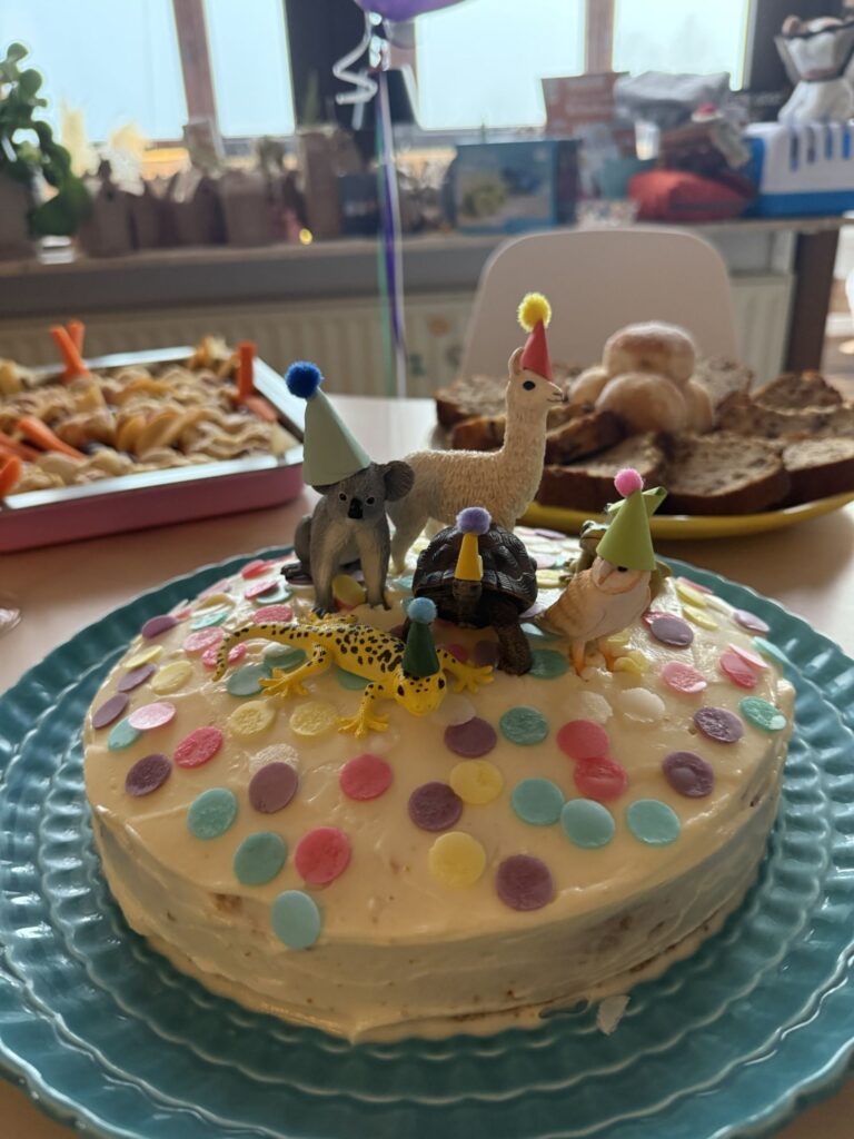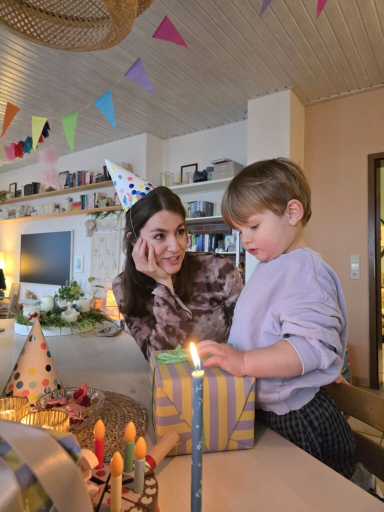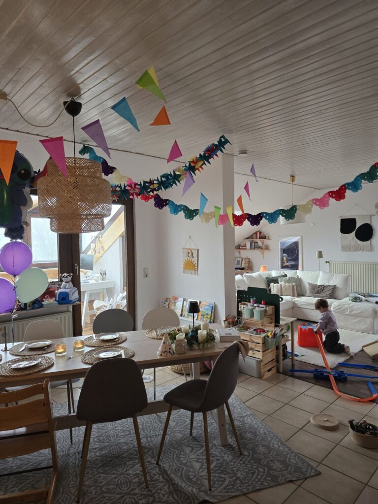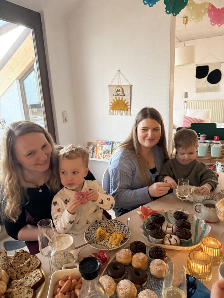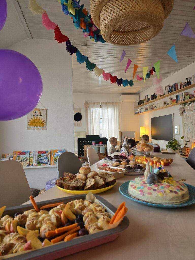 Nach dem Frühstück war noch Spielzeit und dann Ausruhzeit. Um 15.00 Uhr kamen die Gaste. Es war ein sehr schöner Spielnachmittag mit ganz wilder Zeit, ruhiger Zeit von allen vier in Mikas Bett und viel Kuchen und Süßigkeiten.