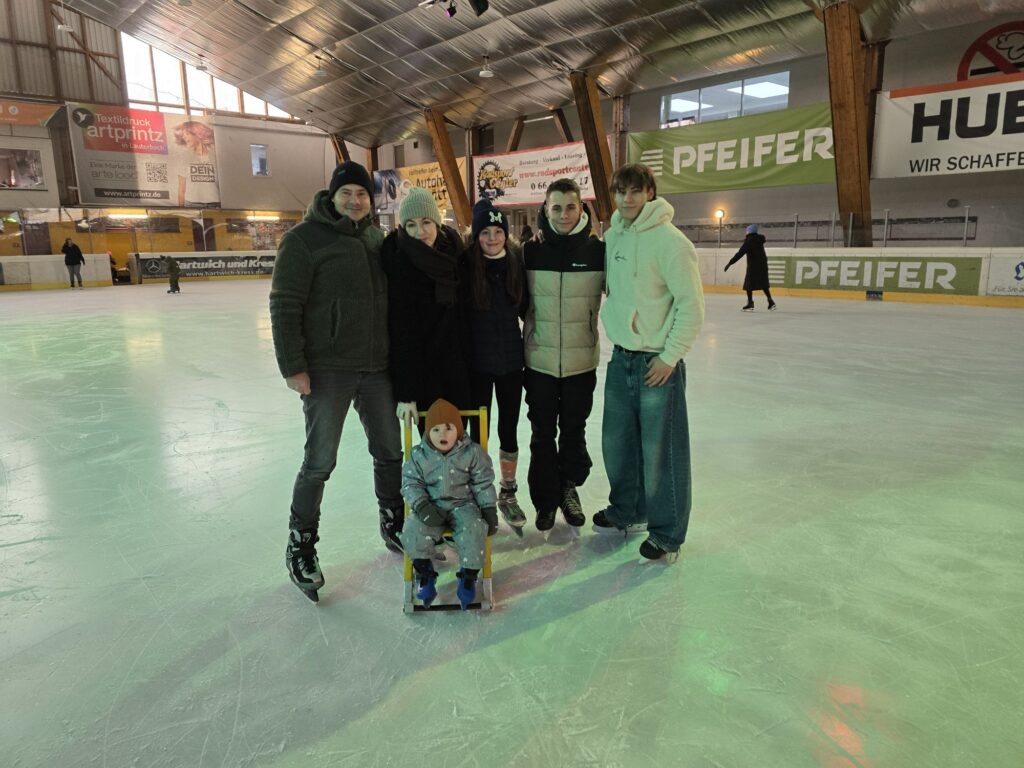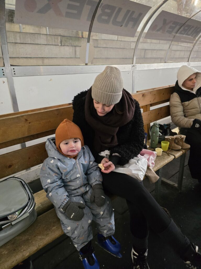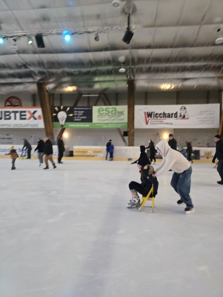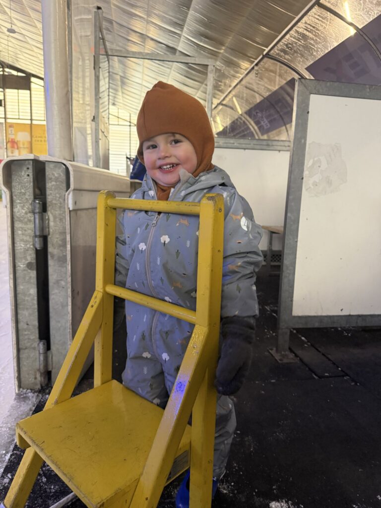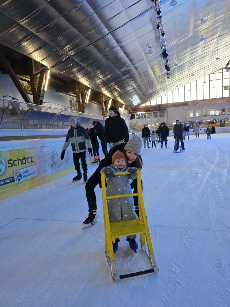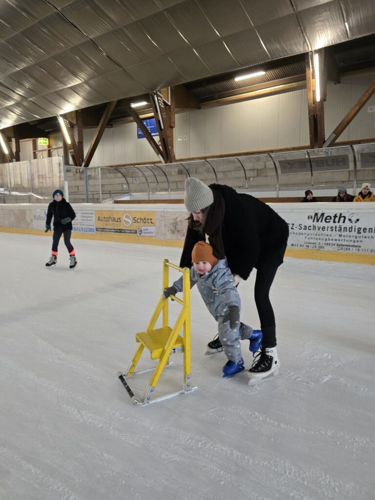 Es gab sogar Schlittschuhe in Mikas Größe. So konnten alle zusammen auf das Eis. Für Mika gab es auch noch einen Lernatuhl. Der Pinguin wäre noch zu groß gewesen. Nach ein paar Runden auch dem Stuhl wollte Mika dann auf den Schlittschuhen stehen. Das hat ziemlich schnell ziemlich gut geklappt. Am Ende ist Mika an den Händen zwischen zwei Großen gefahren.