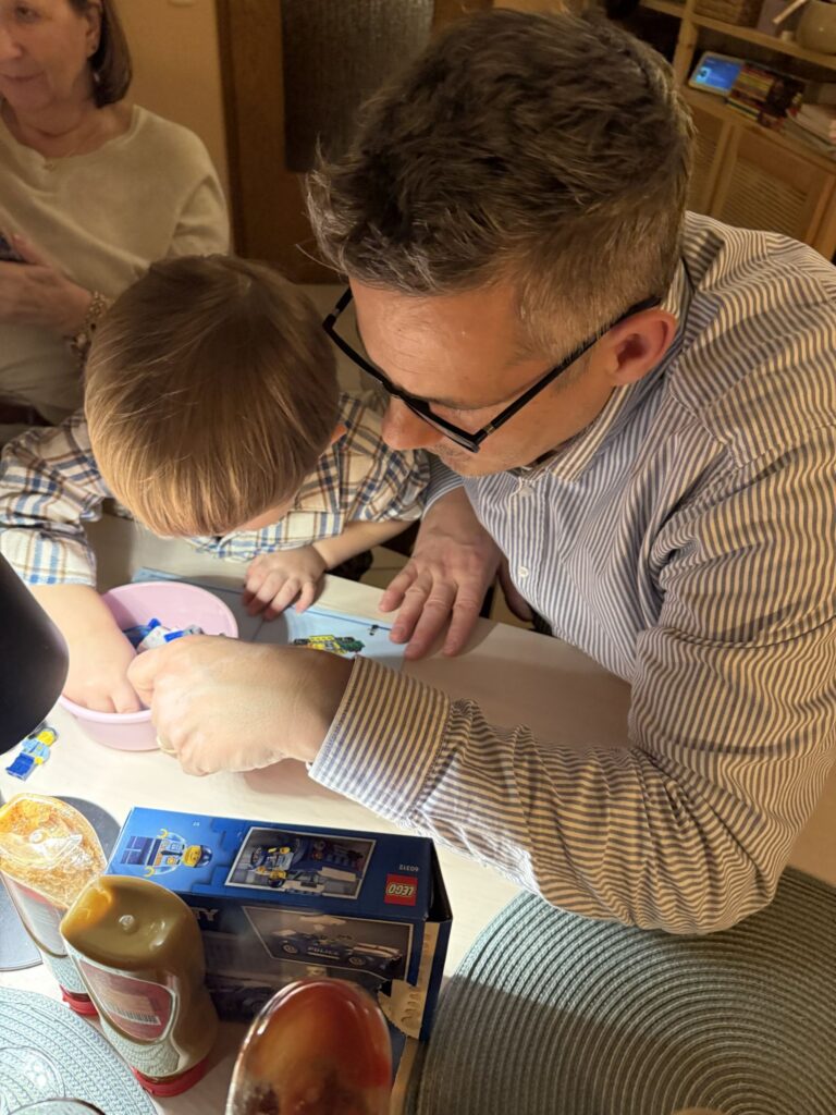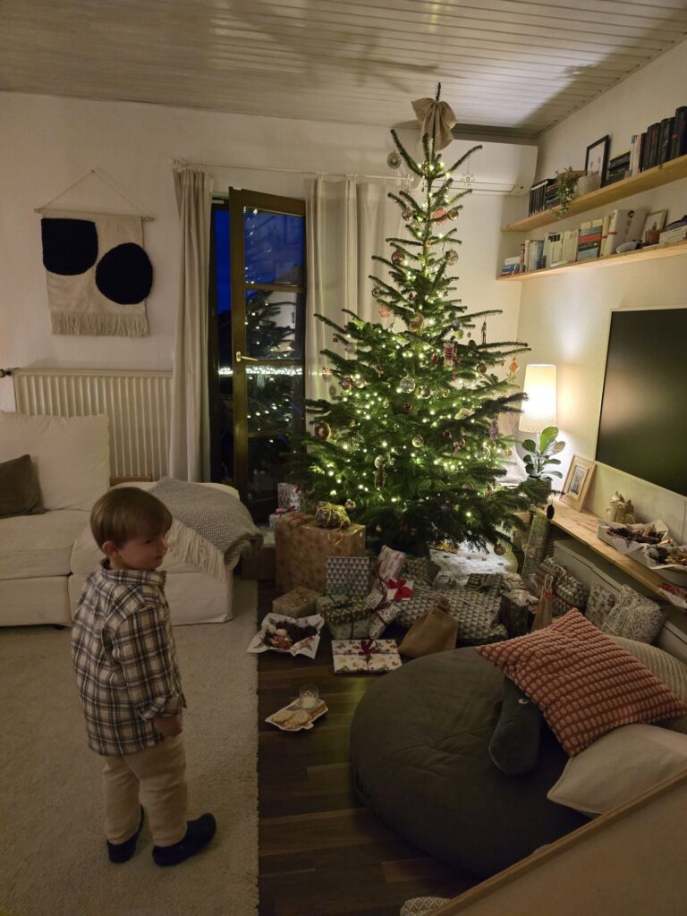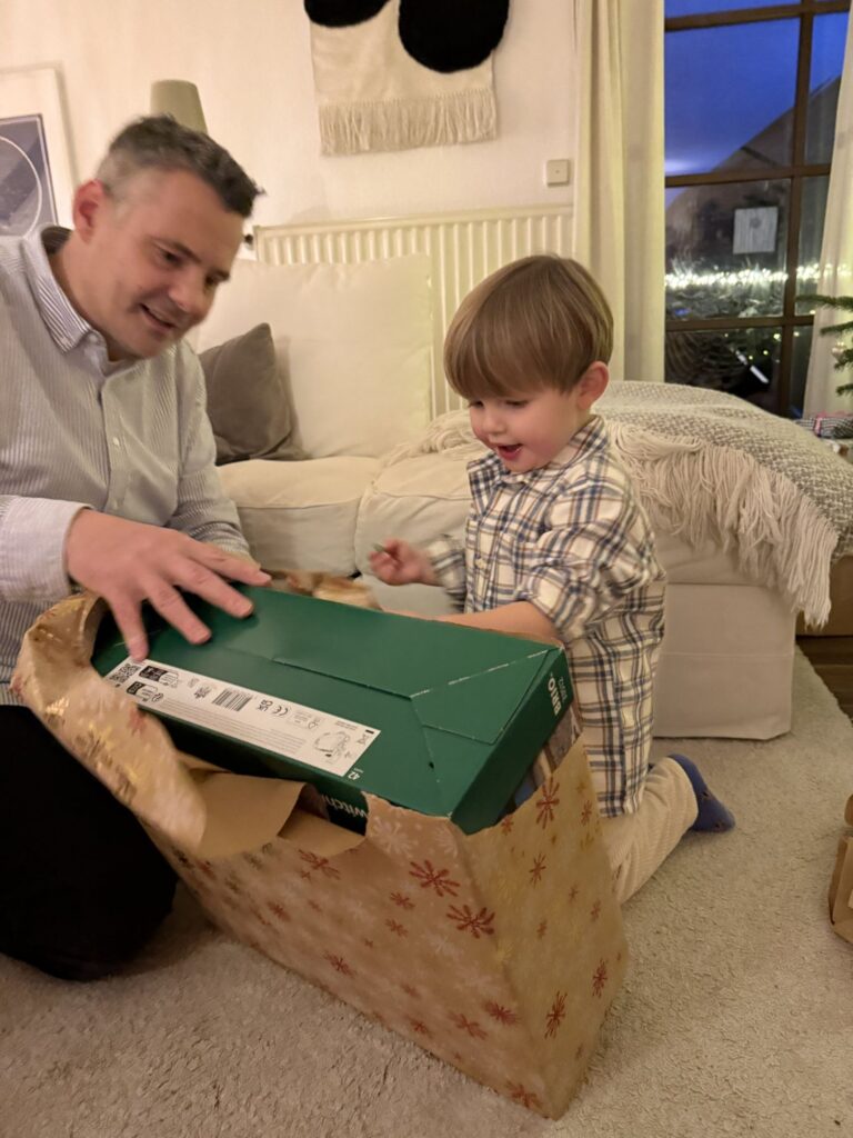 Es war eine sehr schöne Bescherung. Mika hat eine Brio Bahn vom Weihnachtsmann bekommen. Und ein Buch. Und ein Lego Auto. Ganz geduldig und sehr hilfsbereit hat Mika bei der ganzen Bescherung, auch für die Großen gewartet und geholfen. Nach dem Abendessen ging es dann aber bald ins Bett.