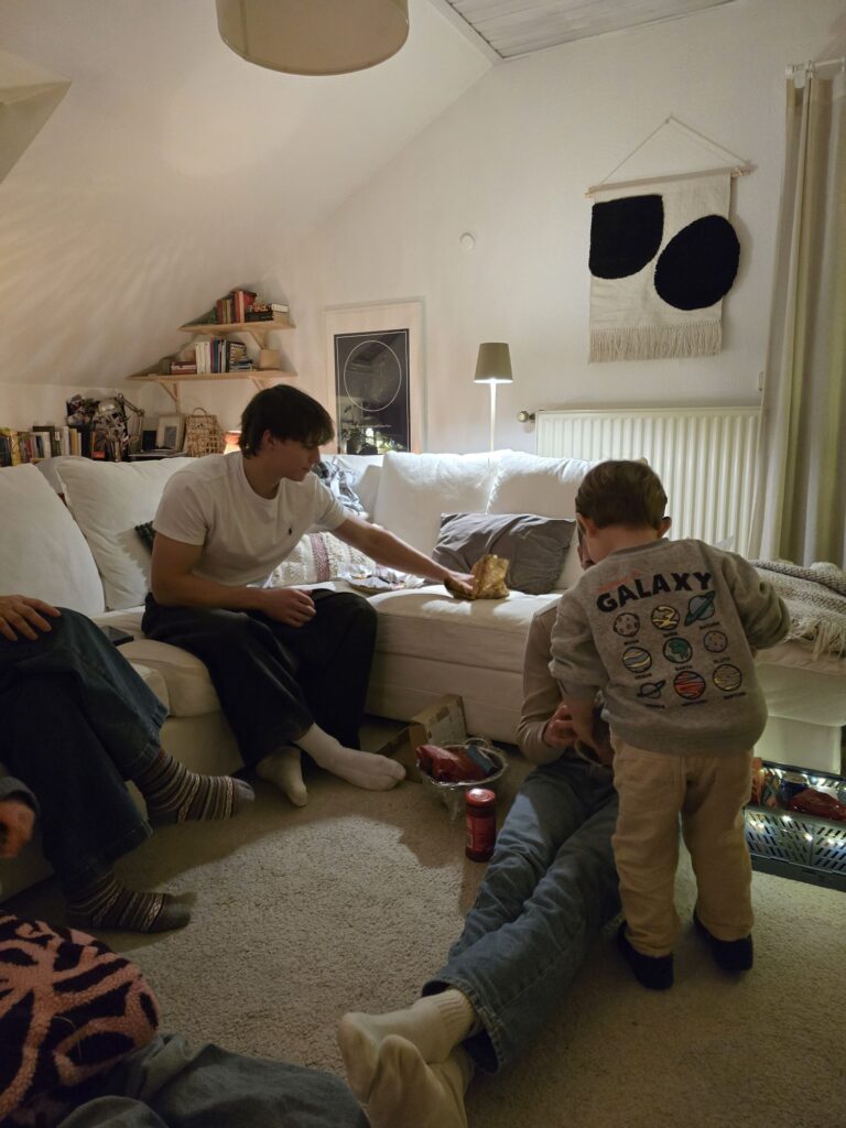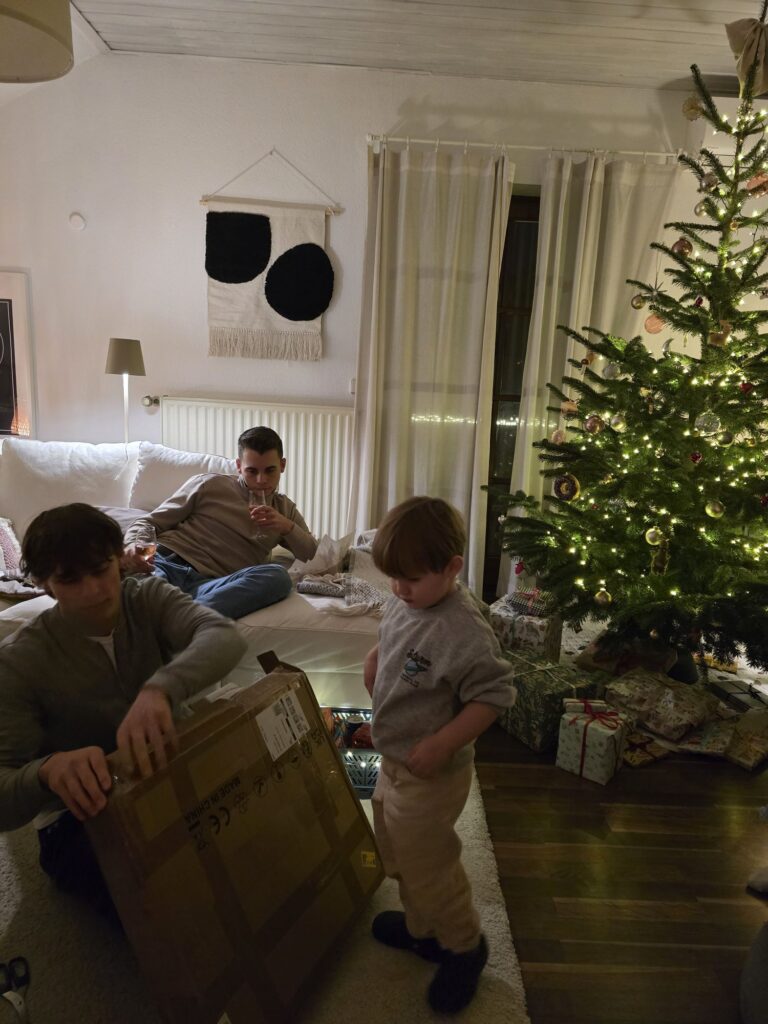 Am Abend gab es dann Weihnachtsessen mit Oma Beatie, Karli, Hannes, Tjark, Janne, Mika, Mama und Papa. Es gab Geschnetzeltes mit Klößen, Rotkohl und Rosenkohl. Nach dem Abendessen ging es dann mit Mama ins Bett.