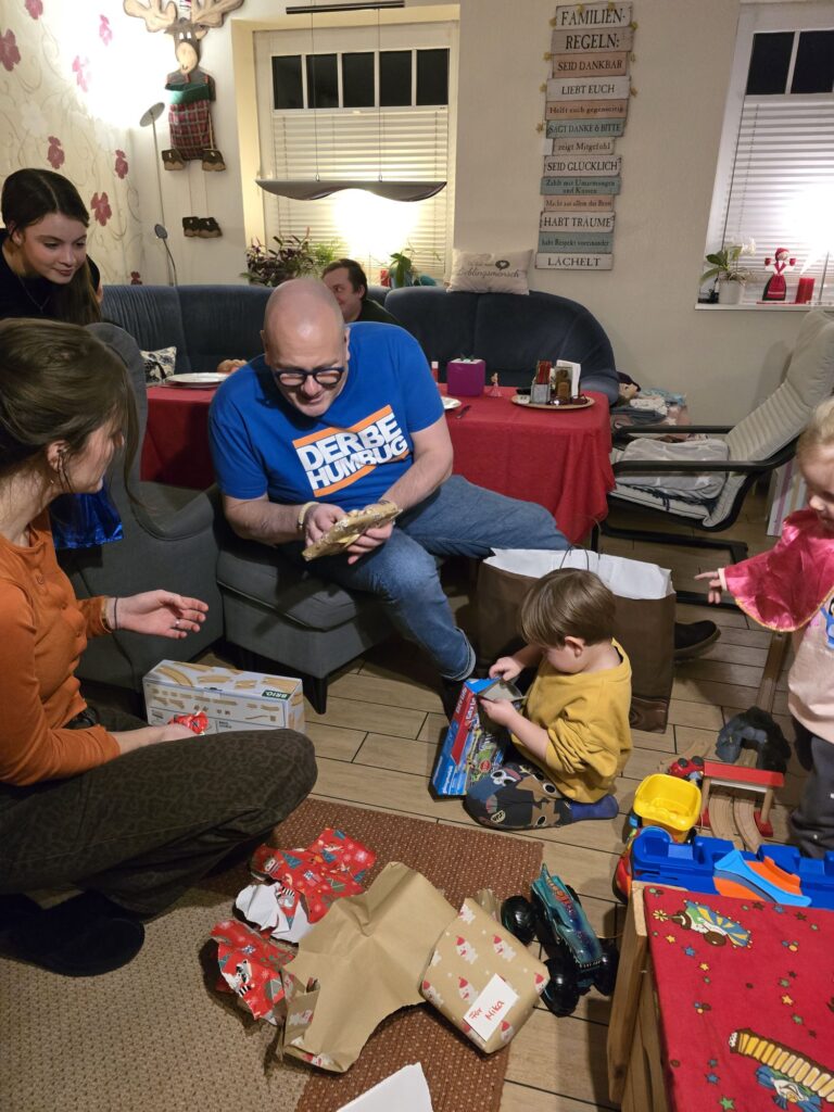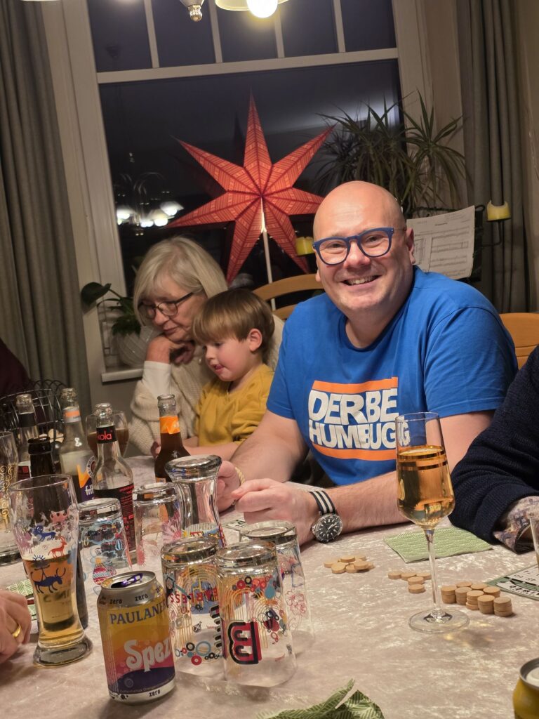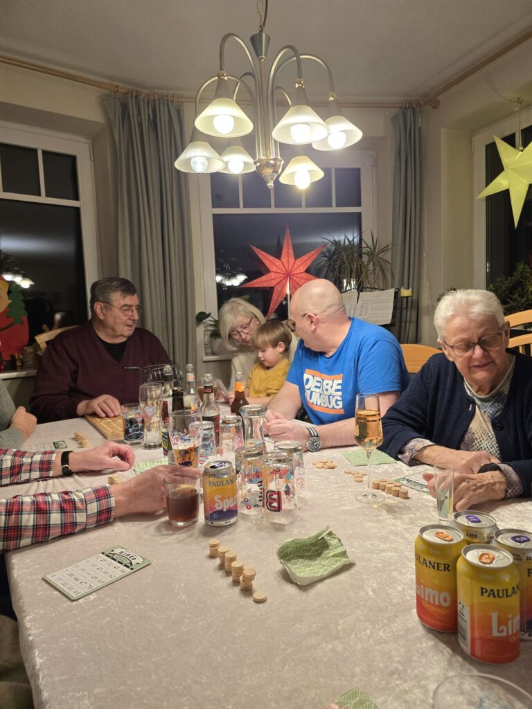 Abends kamen dann Oma und Opa und der ganze Besuch zum Bingo-Abend. Zuerst gab es mit allen aber noch Würstchen und Salate. Mika hat ordentlich reingehauen und fast zwei ganze Würstchen gegessen. Den Bingo-Abend über haben Mika und Thilda weiter zusammen gespielt.
