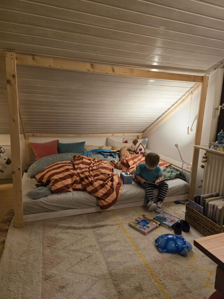 Frühstück gab es so spät, dass es danach schon zum Mittagsschlaf ging. Erst war Mika dabei ganz zappelig, aber Papa hat ihn dann doch gebändigt.