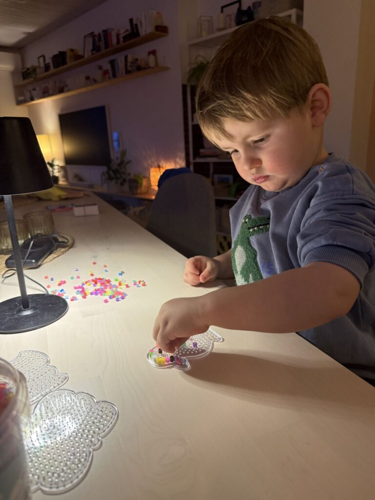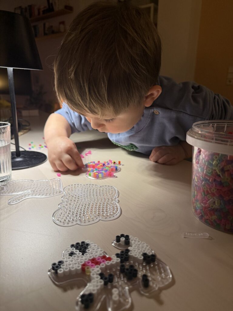 Nachmittags sind Mika und Mama zum Einkaufen gefahren und haben auch Bügelperlen gekauft. Das hatte Mika sich gewünscht. Im Kindergarten gibt es auch welche, aber die dürfen nur die Großen machen. Mit ganz viel Geduld und Spaß hat Mika ganz alleine eine Ente aus den Bügelperlen gemacht.