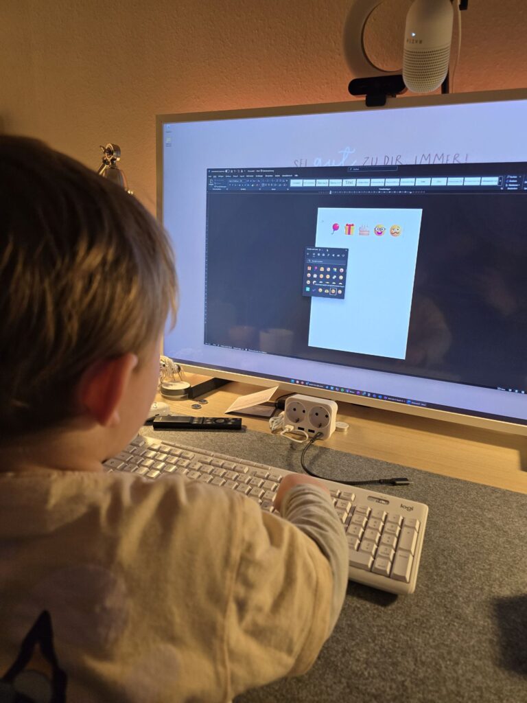 Am Nachmittag haben Mika und Mama erst ganz lustig zu Hause gespielt. Dann hat Mika noch ein bisschen bei Papa im Büro zugeguckt und als Papa mit der Arbeit fertig war, haben die beiden noch Smileys am Computer ausgesucht.
