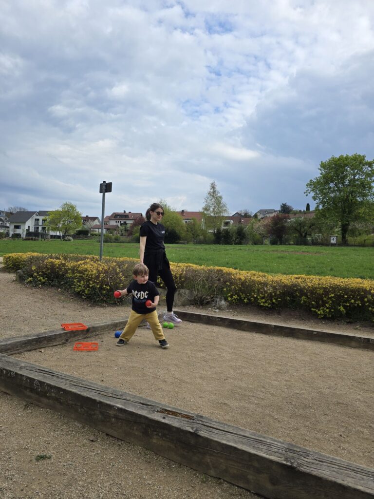 Nachmittags ging es mit Mama und Papa zum Sportplatz. Danach noch zum Boule Platz, um die Kugeln auszuprobieren, die Mika sich von Waltraud ausgeliehen hatte.