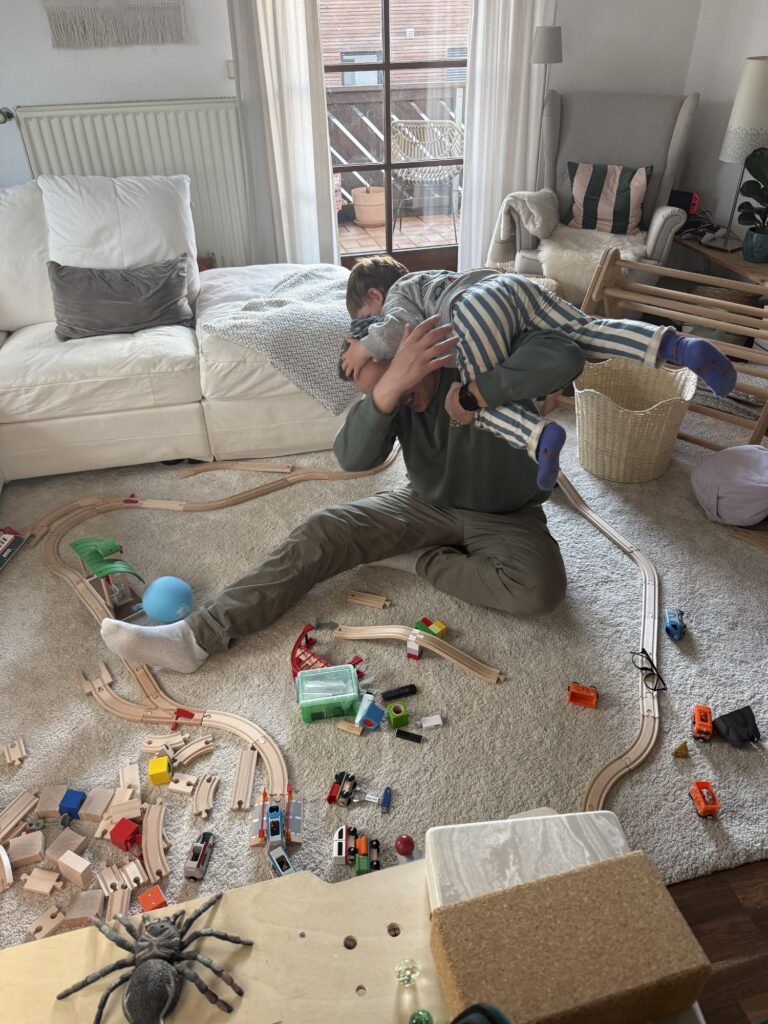 Papa ist mit Mika um 6.20 Uhr aufgestanden. Mika hatte Hunger. Es hat ganz doll geregnet und gewittert. Einmal hat es genau über dem Rauschenberg geblitzt und gedonnert – gleichzeitig. Auch sonst war am Morgen viel Spielzeit. Mika und Papa haben auch die Brio Bahn aufgebaut. Später haben Mama, Mika, Tjark und Papa zusammen gefrühstückt. Tjark ist danach mit Mika rausgegangen. Die beiden haben Boule gespielt.