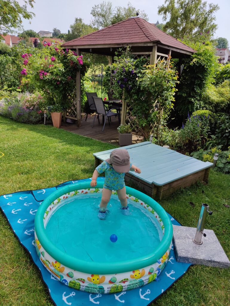 Am Nachmittag hat Mama das Planschbecken im Garten aufgebaut und Peter das Wasser klargemacht. Darin zu planschen hat Mika total viel Spaß gemacht.